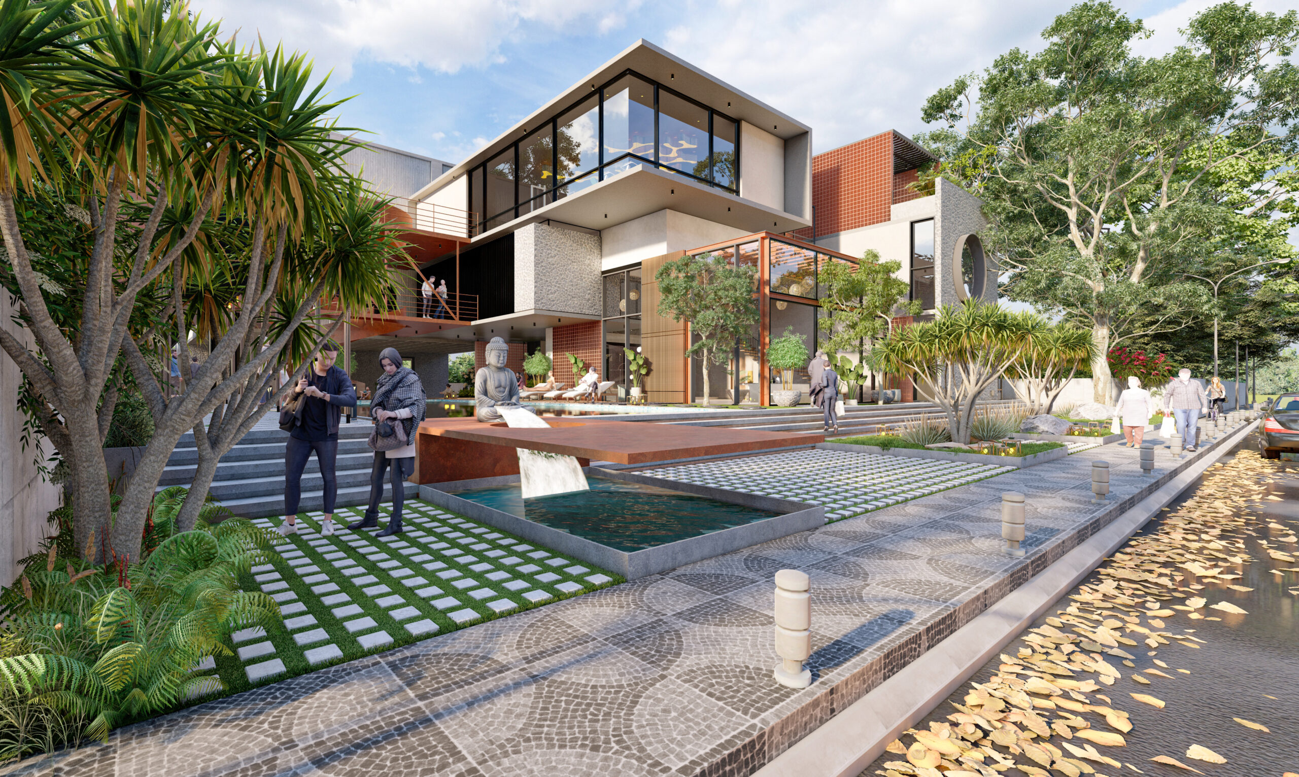 Ground surfaces feature geometric tile mosaics and linear wood strips that add visual interest and help define different areas. Seating arrangements include timber benches and stone steps at various levels, accommodating both small groups and larger community gatherings. Patterned walkways and courtyards guide residents through the campus, connecting homes to amenities.