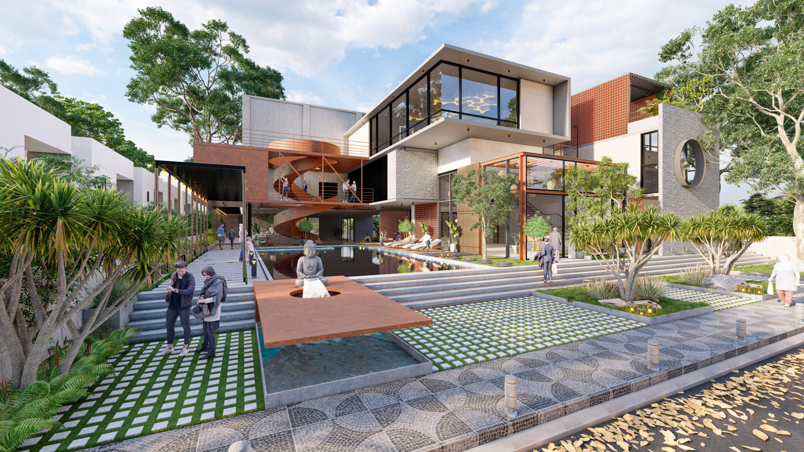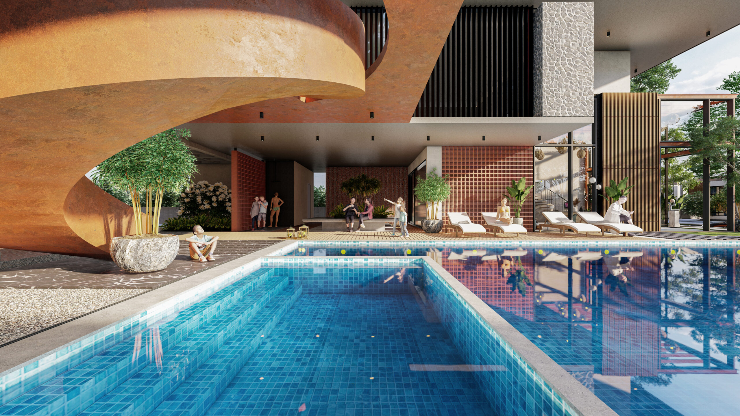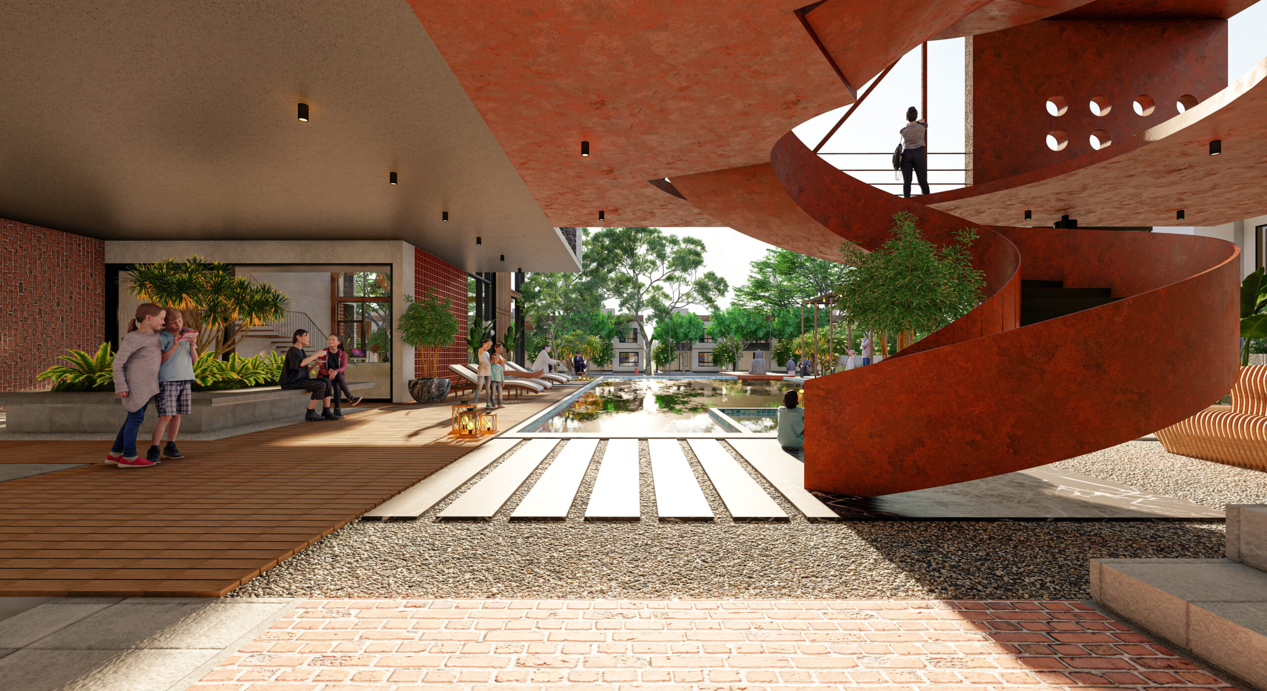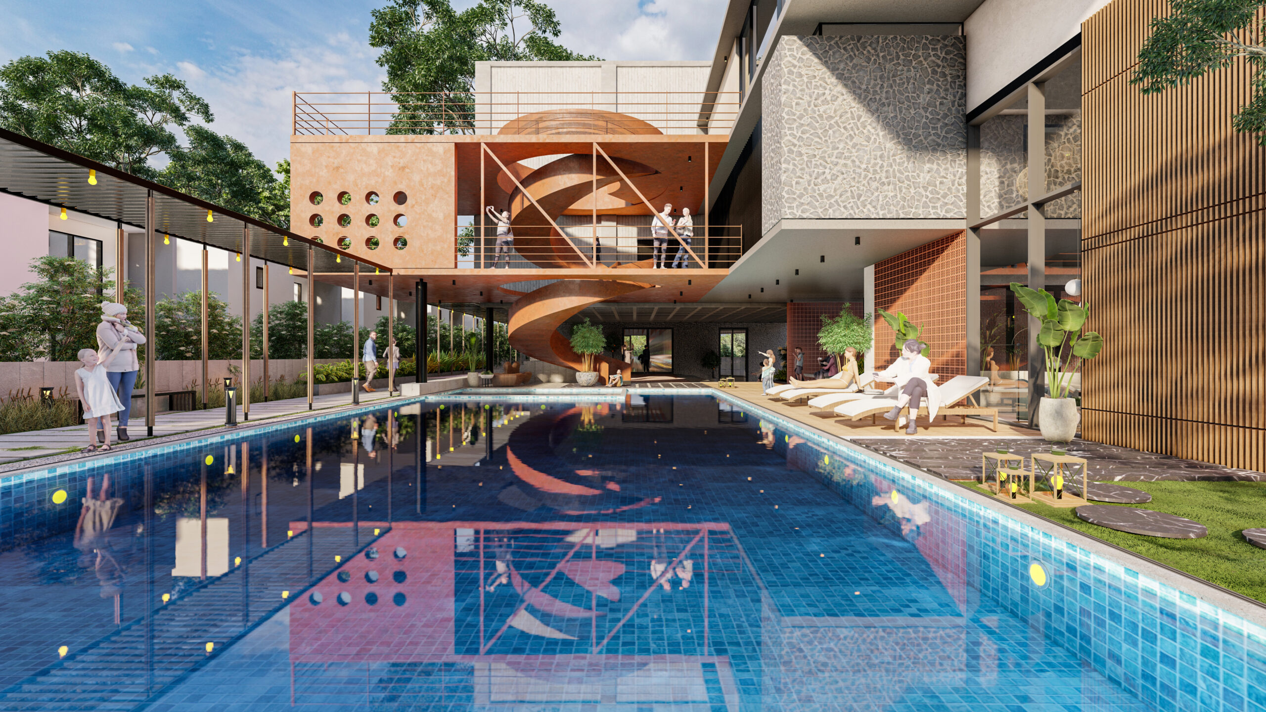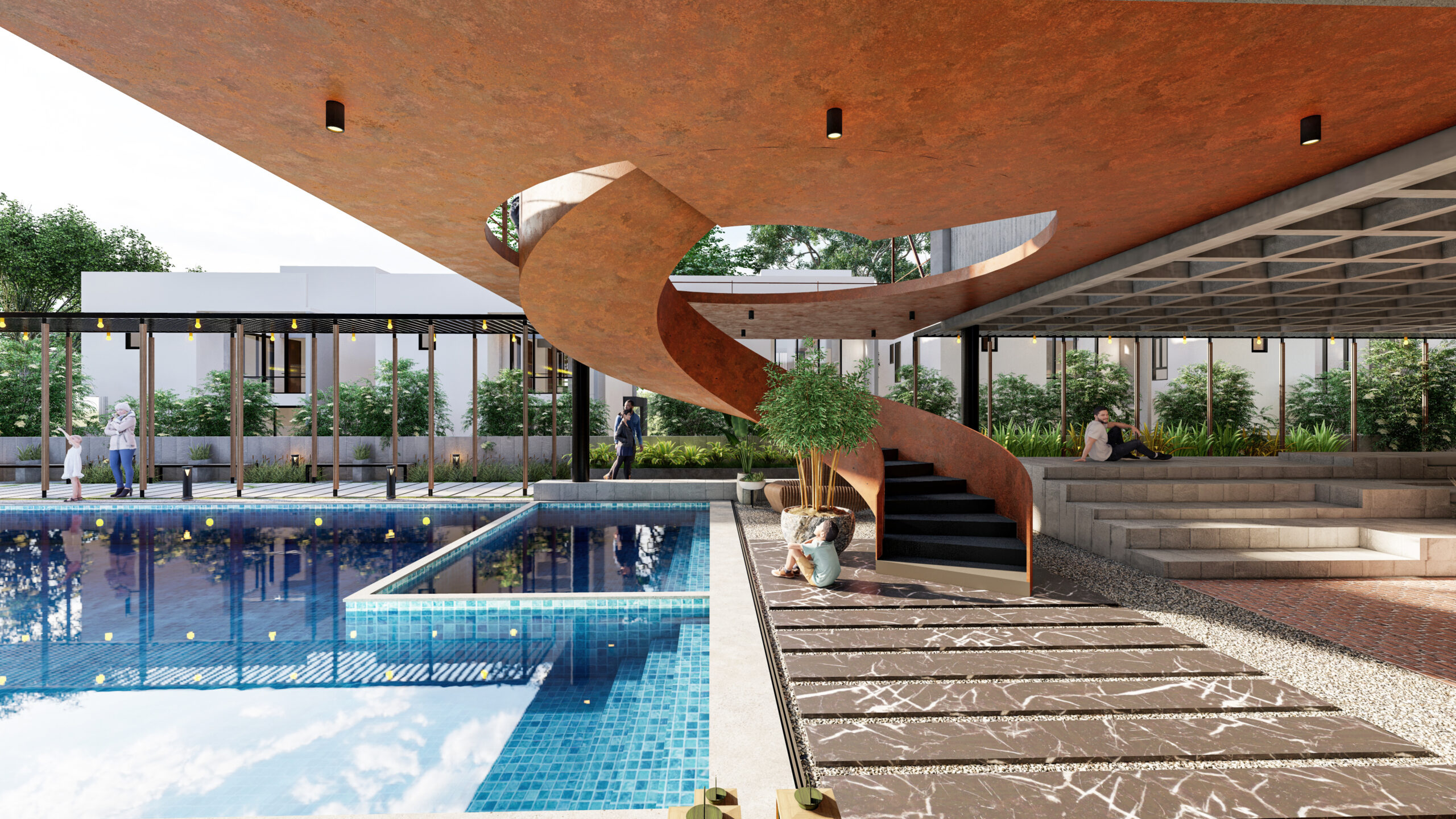 The clubhouse features a sculptural helical staircase made of corten steel gutters flowing upwards in a serpentine fashion connecting the upper floors. The inquisitive aspect of the positioning of this staircase is that it lets horizons over the mirror shell pool creating reflections and an illusion of an infinity loop.