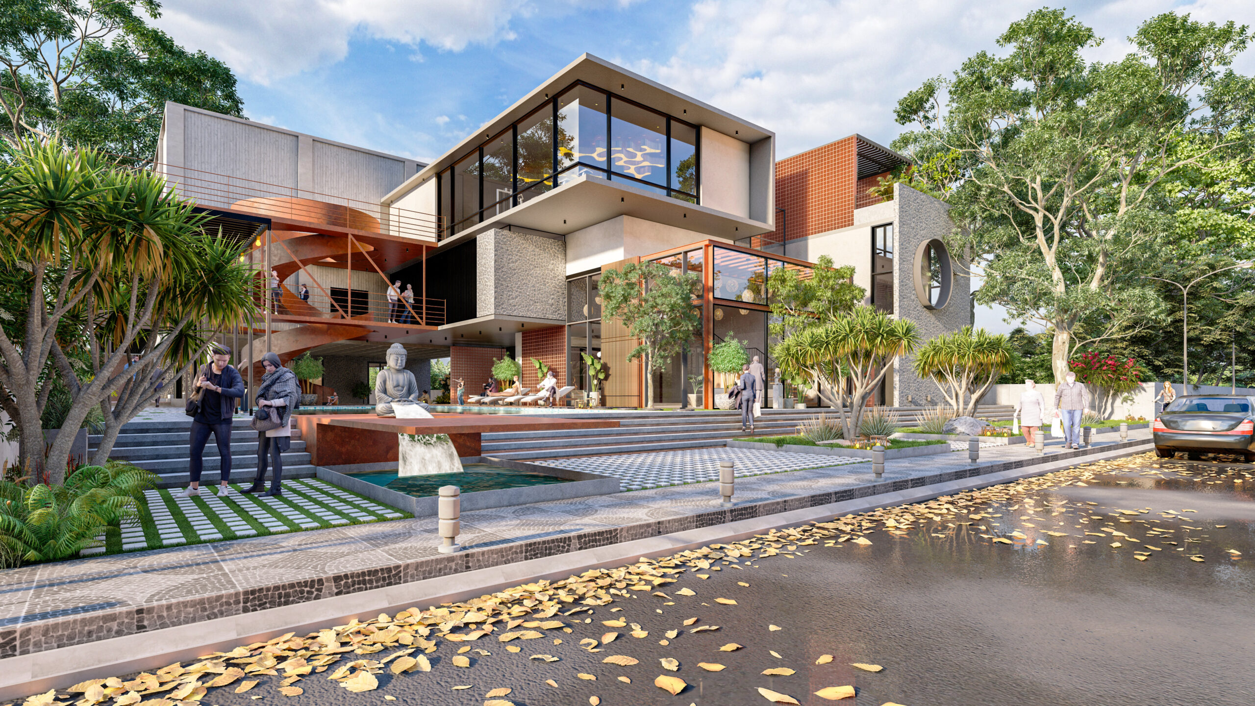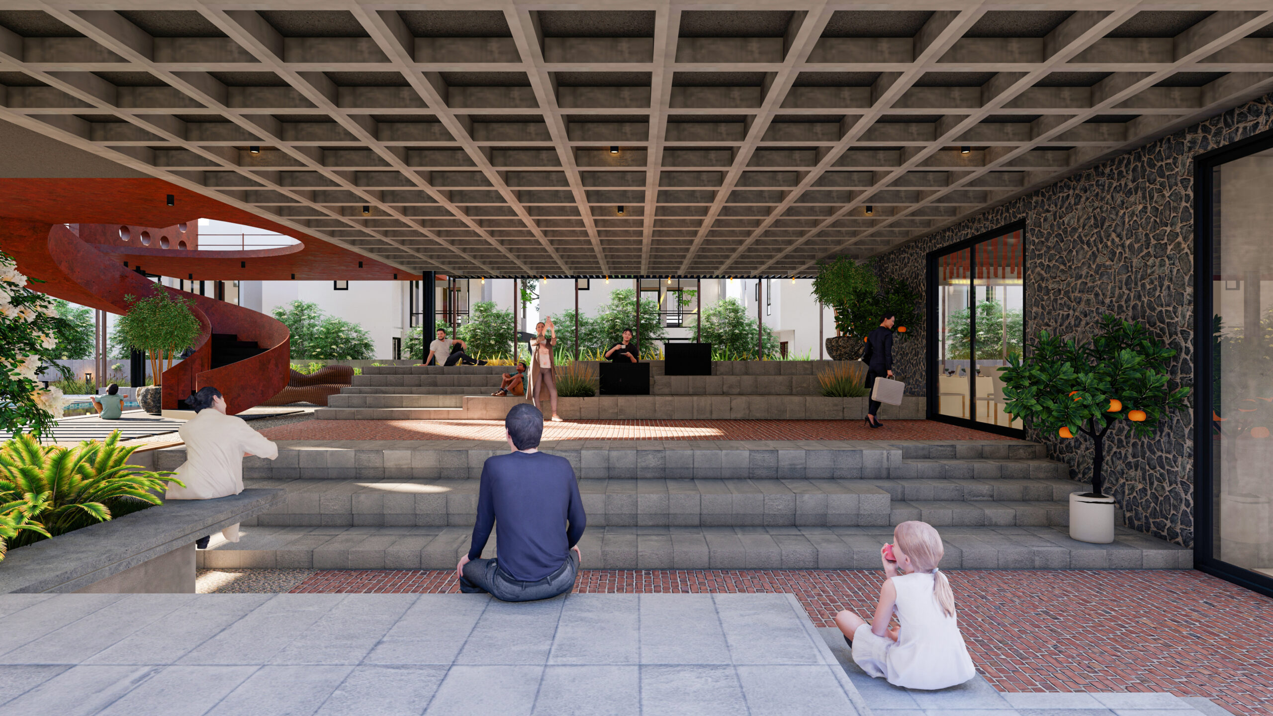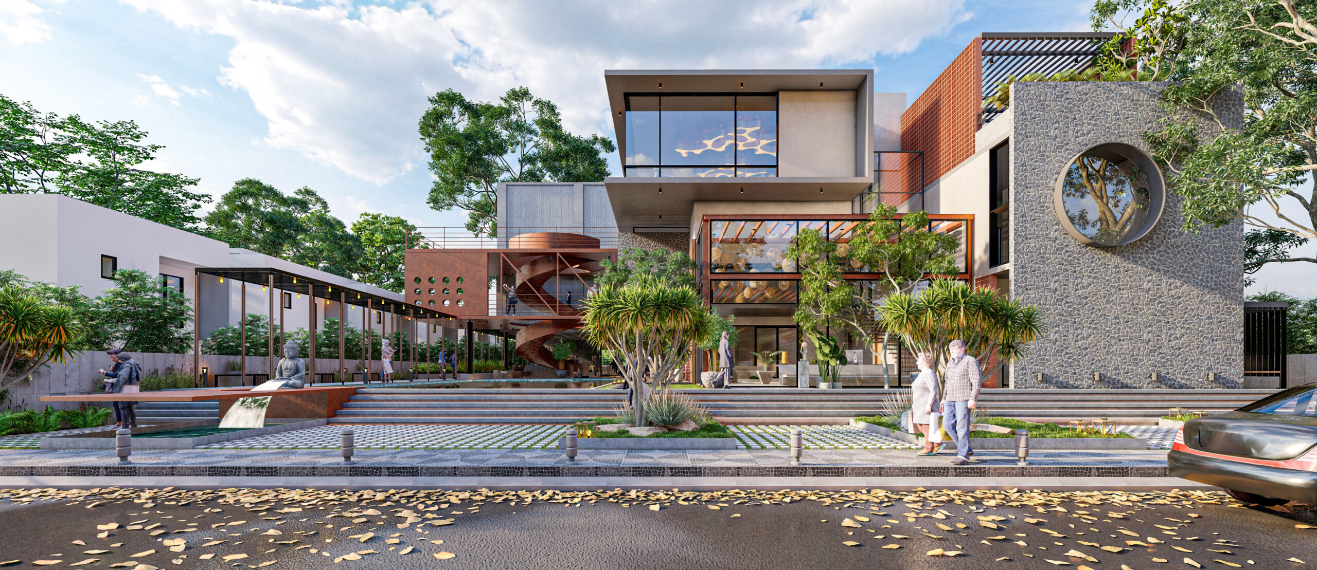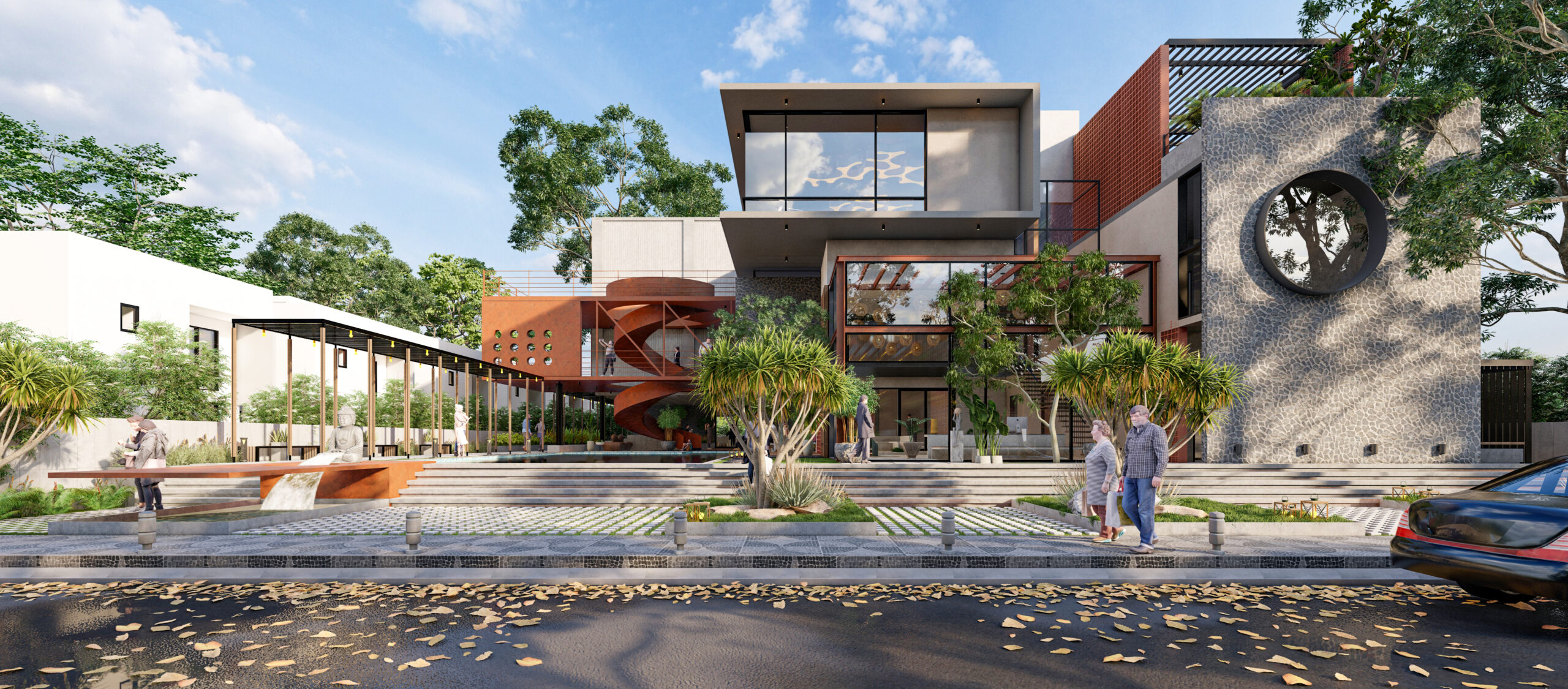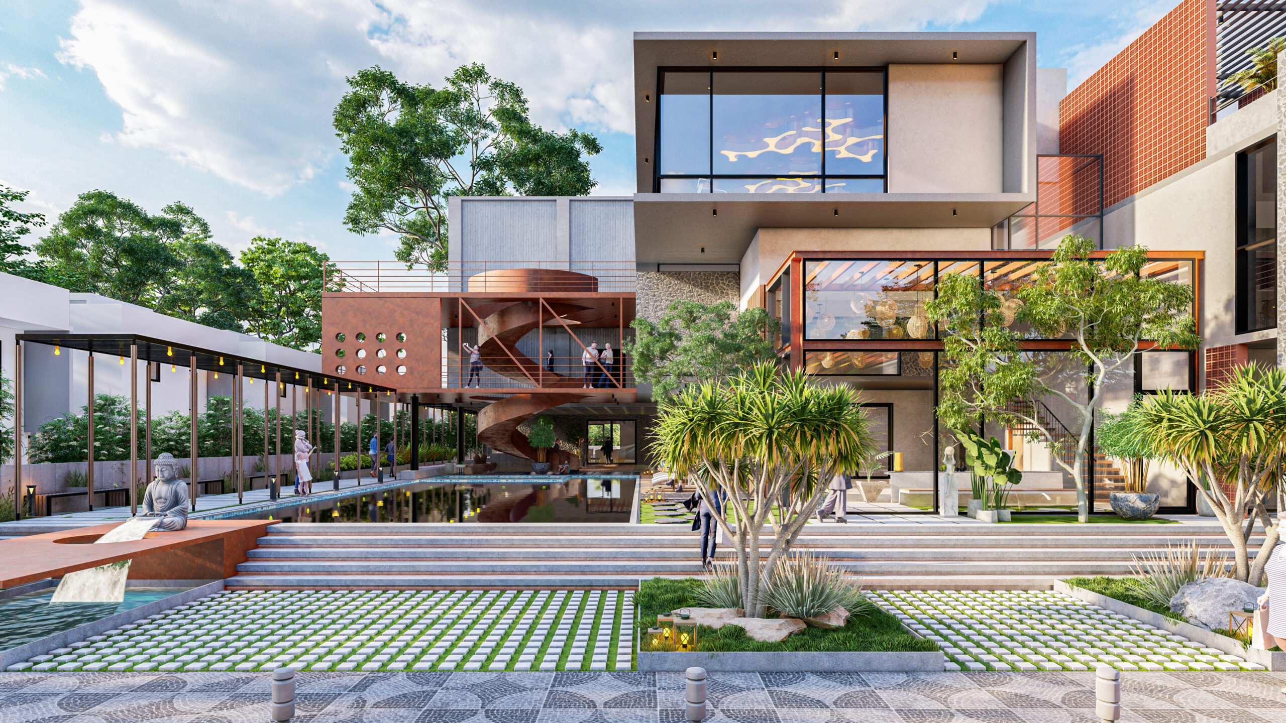 The clubhouse features a sculptural helical staircase made of corten steel gutters flowing upwards in a serpentine fashion connecting the upper floors. The inquisitive aspect of the positioning of this staircase is that it lets horizons over the mirror shell pool creating reflections and an illusion of an infinity loop.