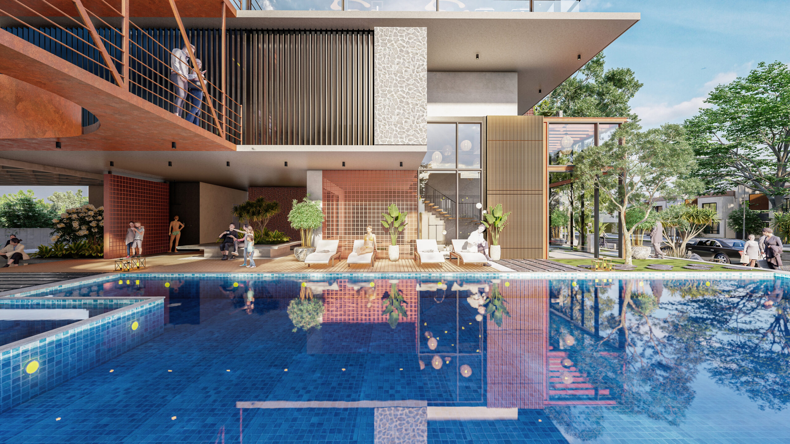 A striking timber roof structure spans portions of the deck, offering shade while creating a visual landmark. This roof doubles as a climate control and artistic feature, making the pool complex instantly recognizable within the development.