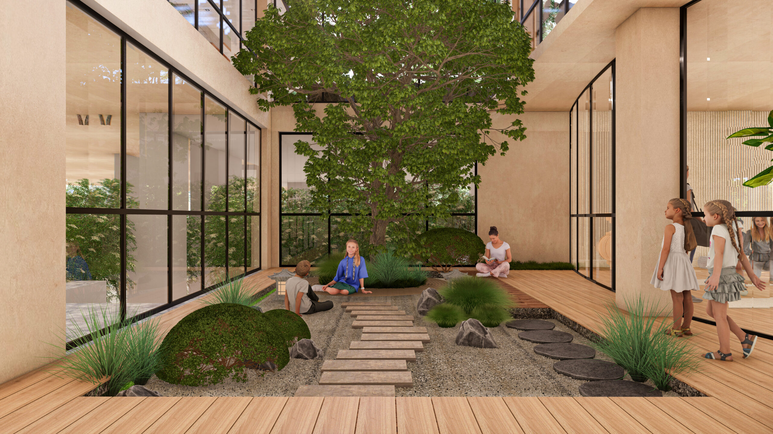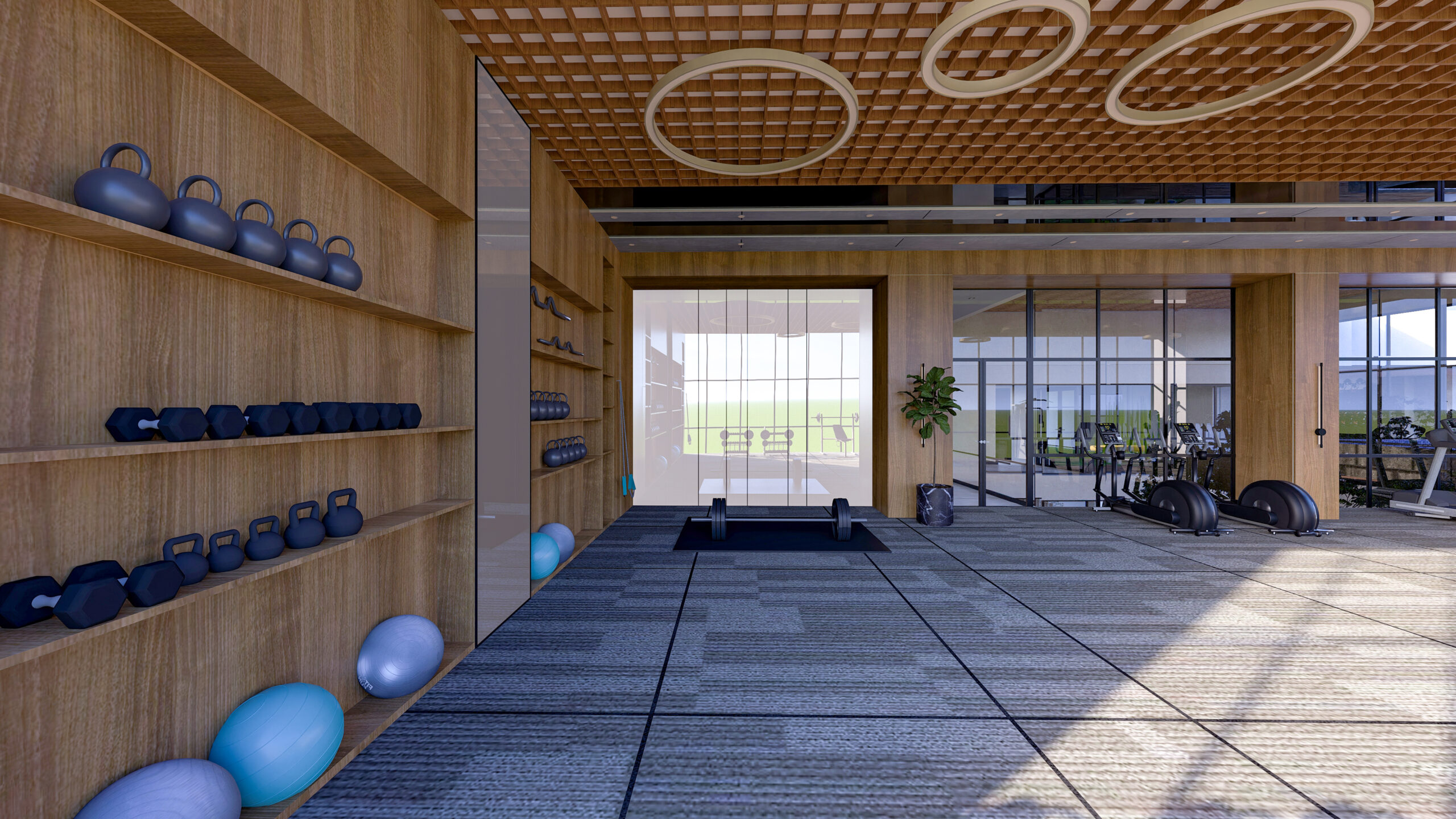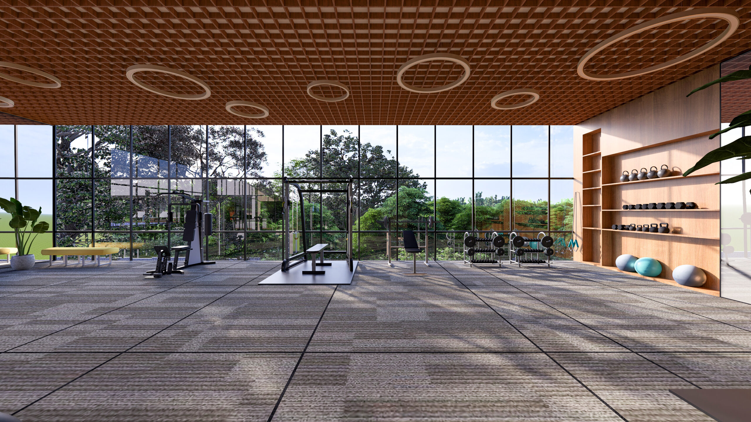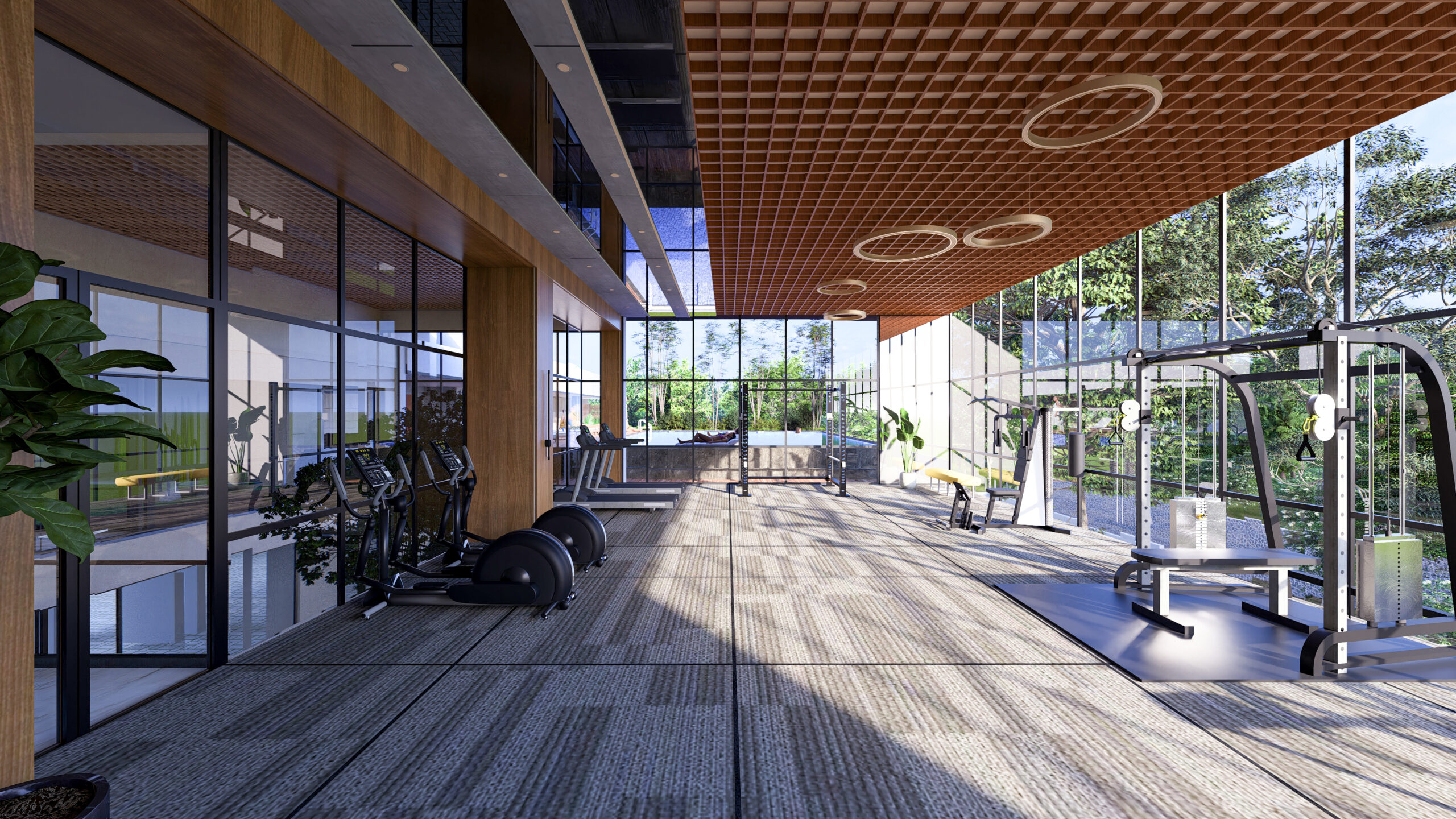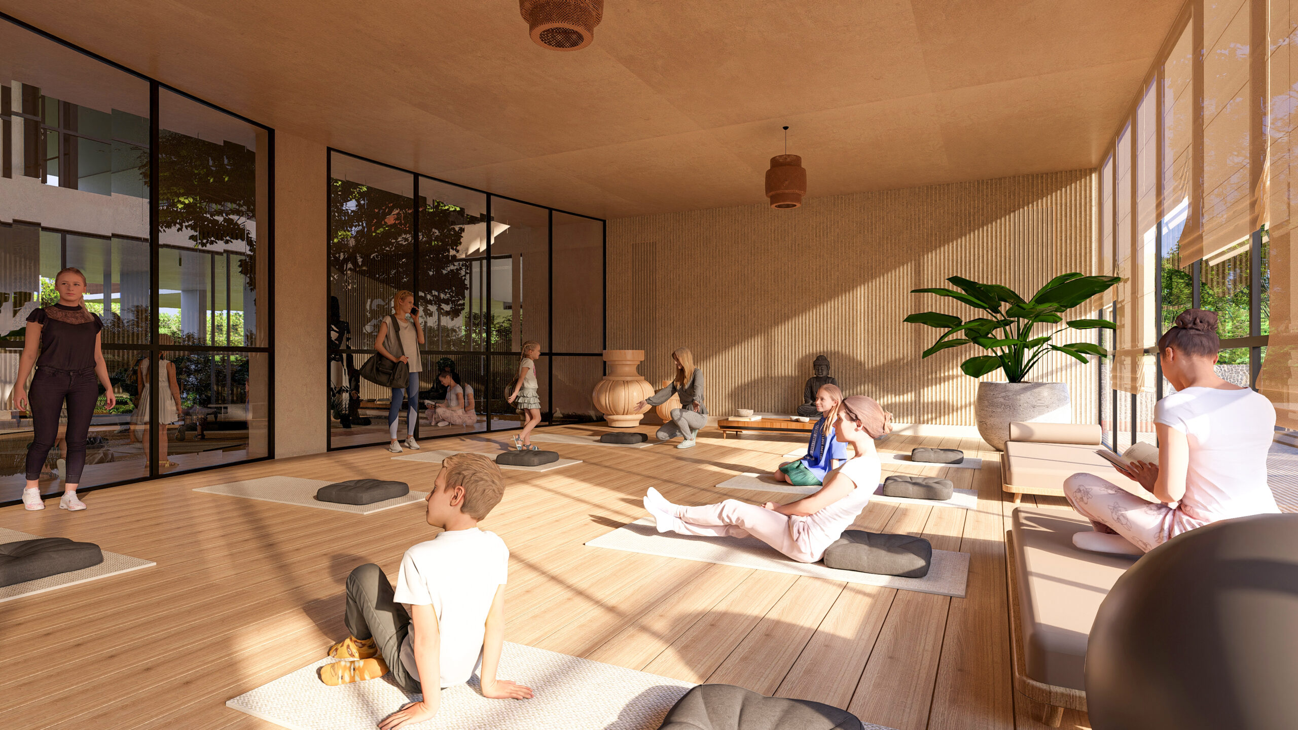 At its heart lies an open-to-sky landscaped courtyard, creating a tranquil core that connects nature with everyday living. The yoga studio and gym open towards this calm courtyard, allowing wellness activities to unfold amidst natural light, greenery, and serenity.