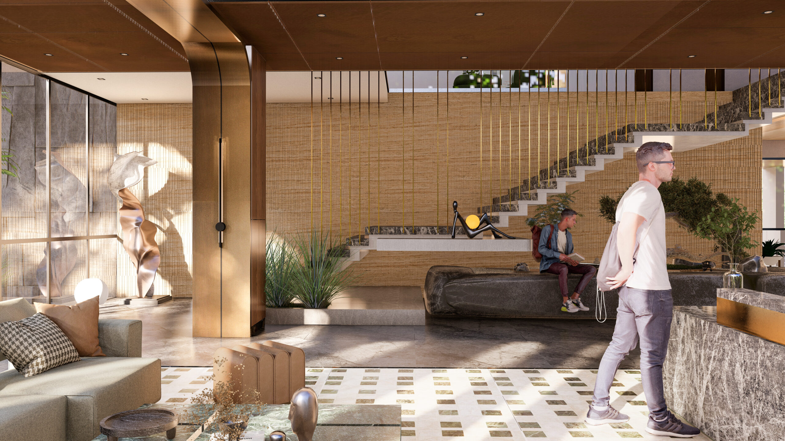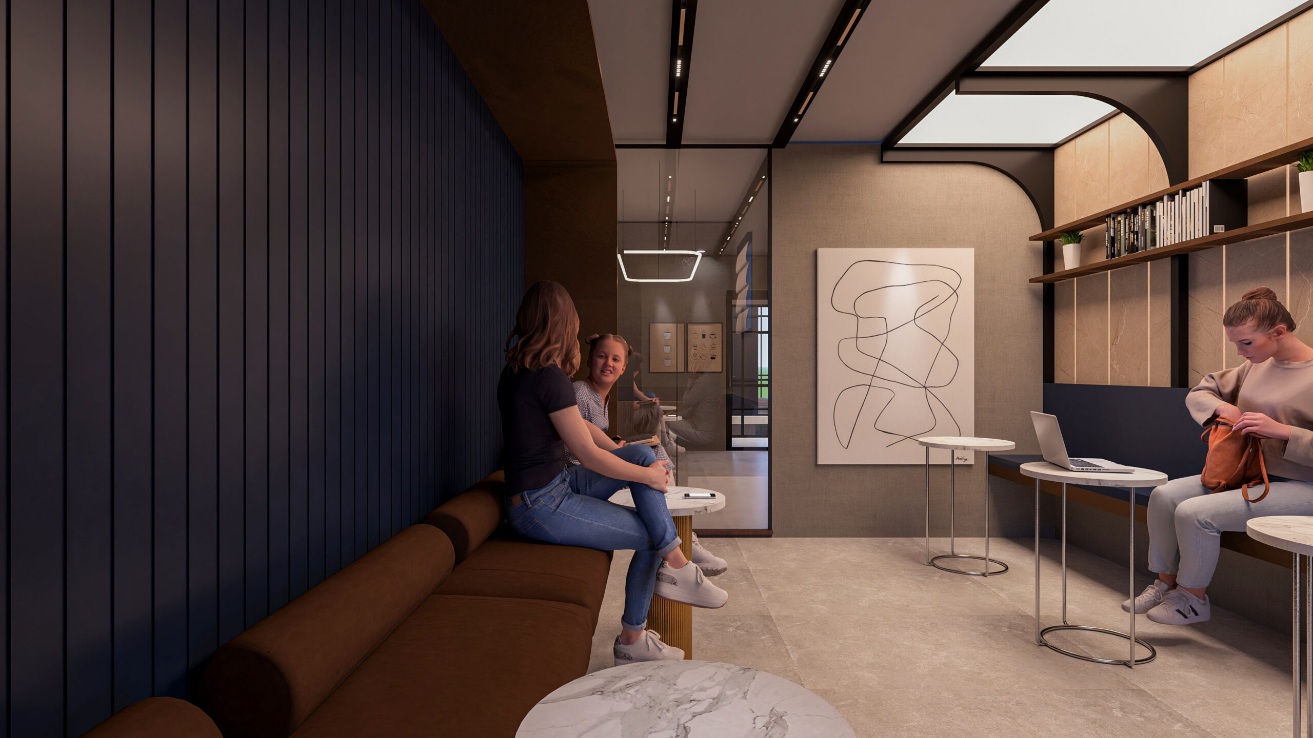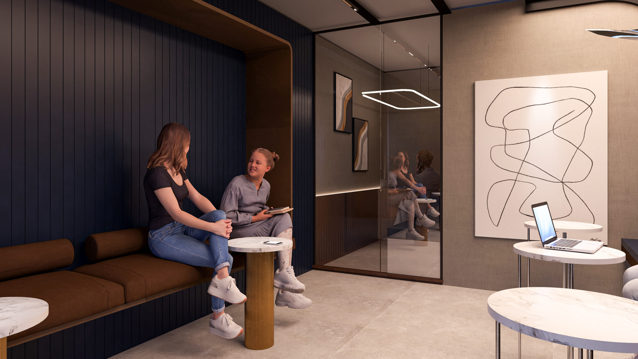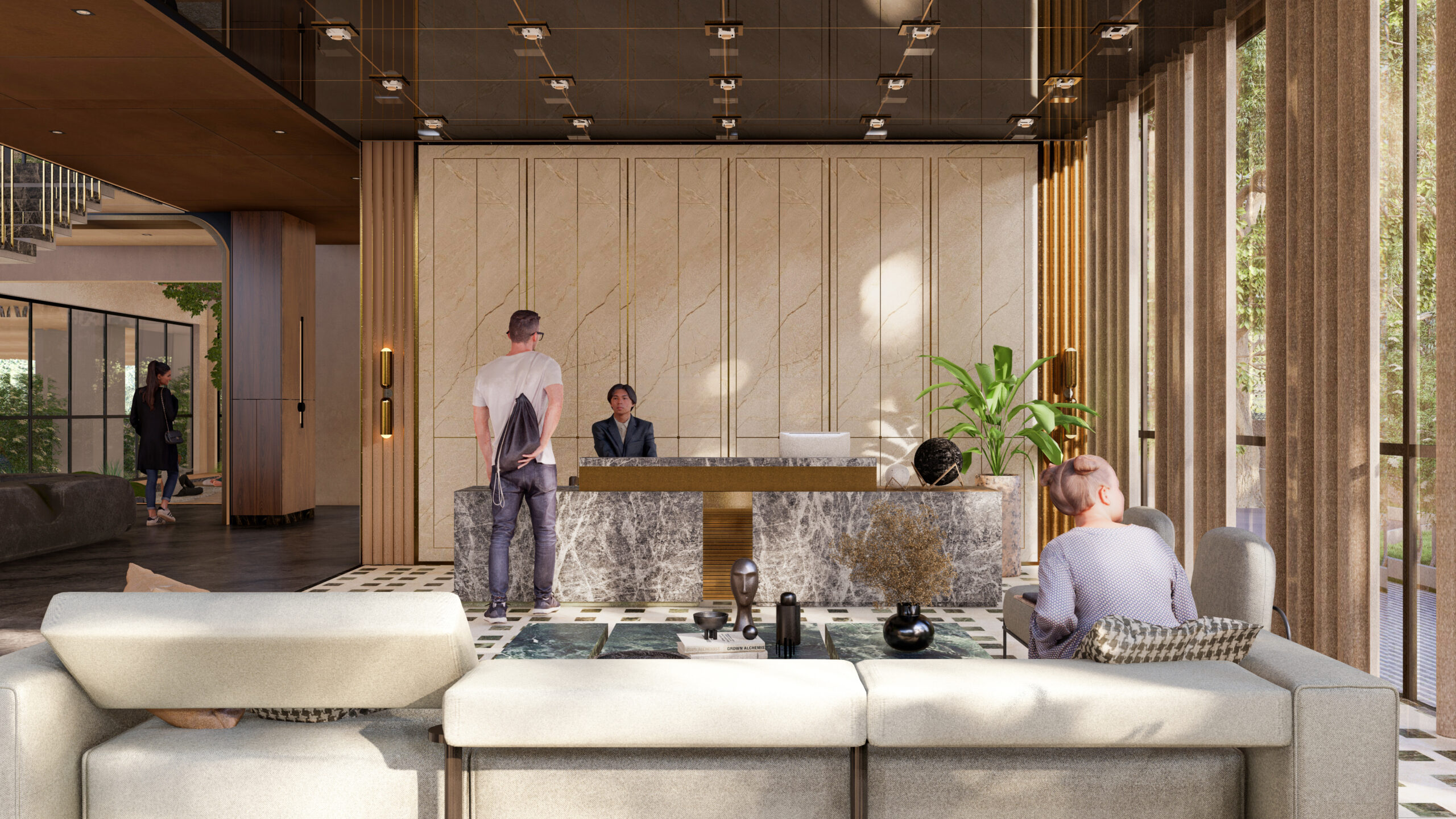 thoughtfully curated spaces. The reception area sets the tone of luxury with rich marble finishes,