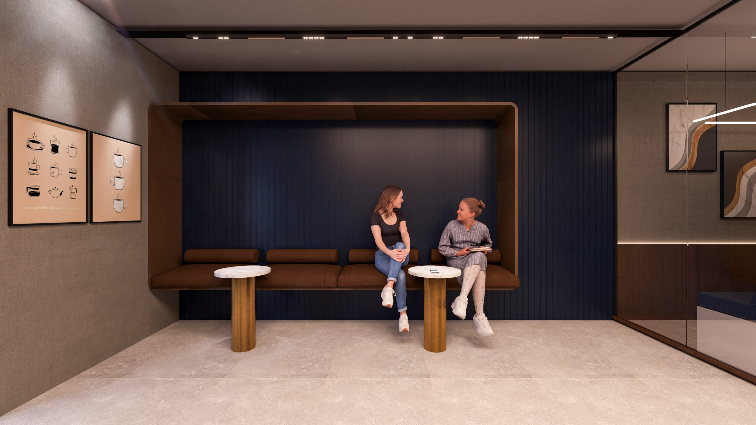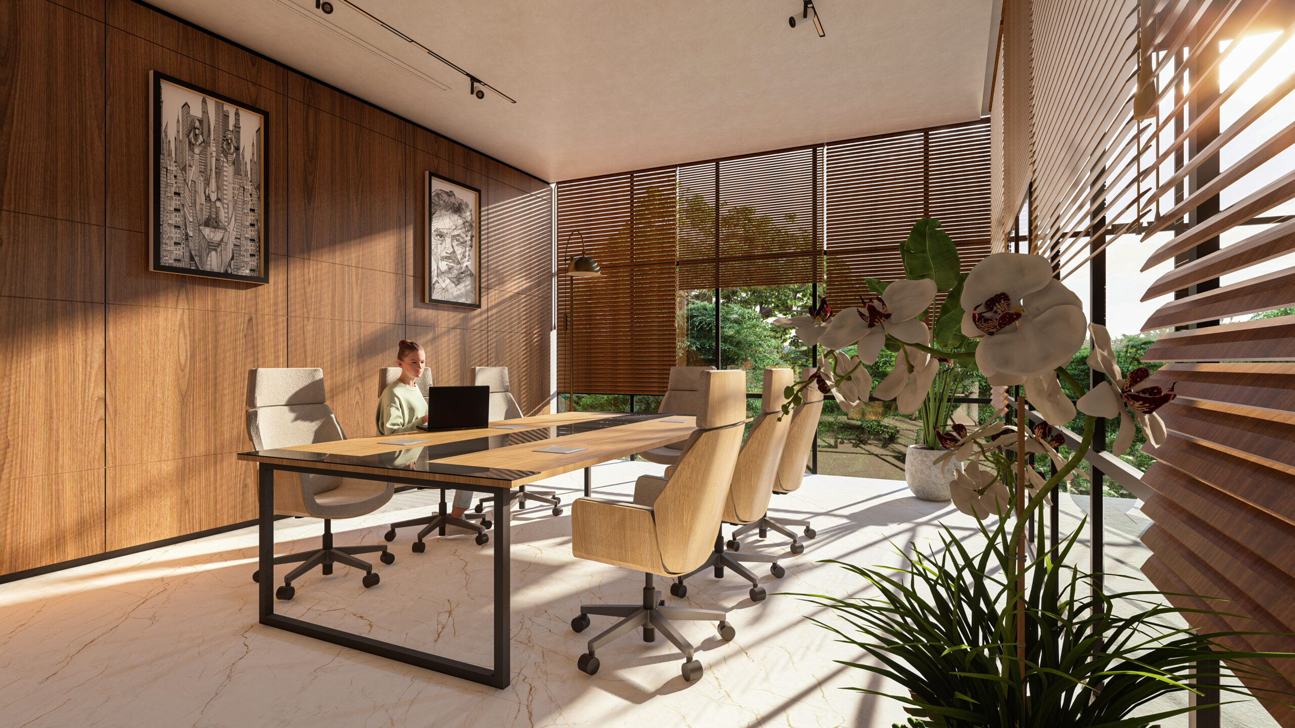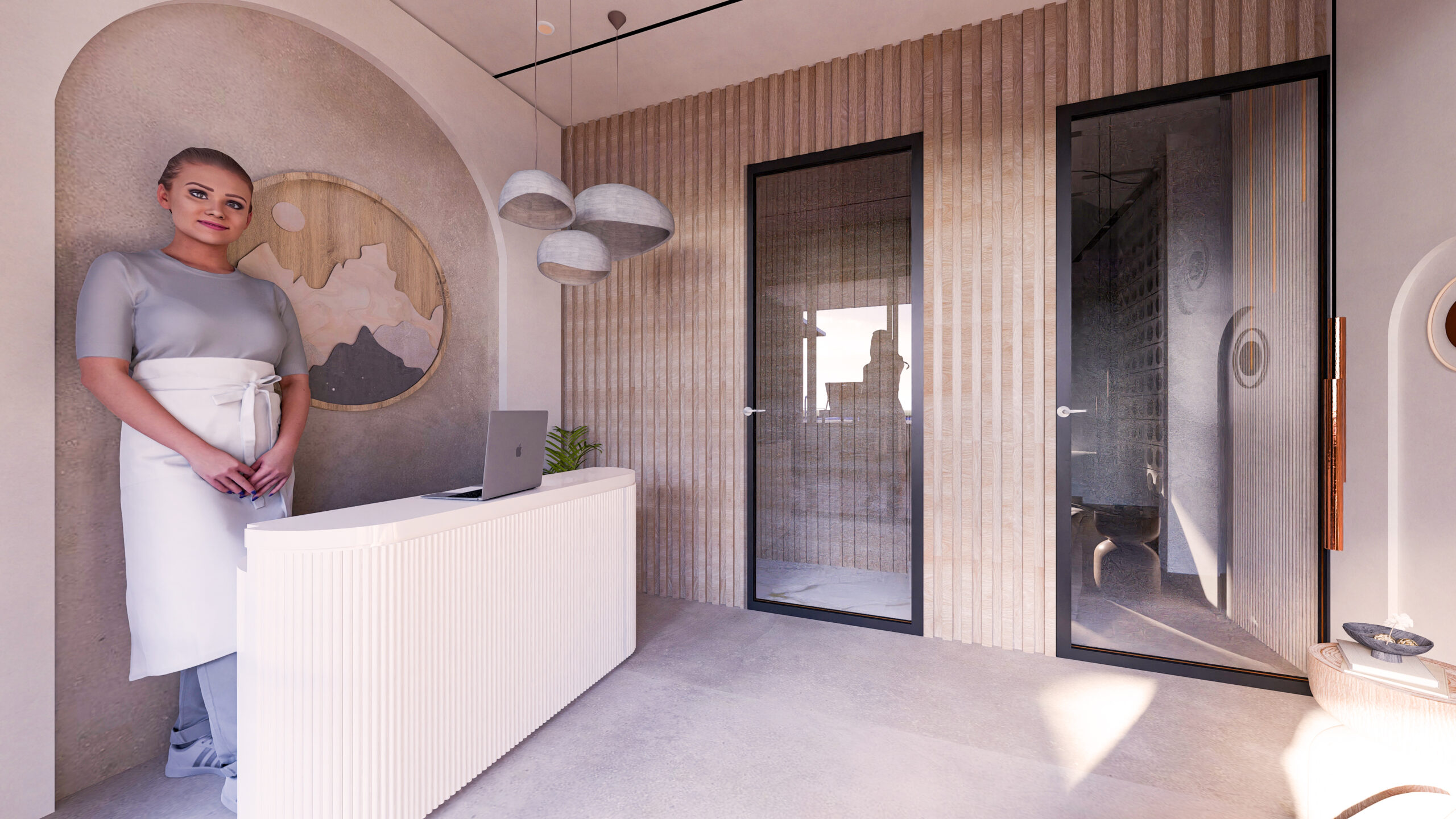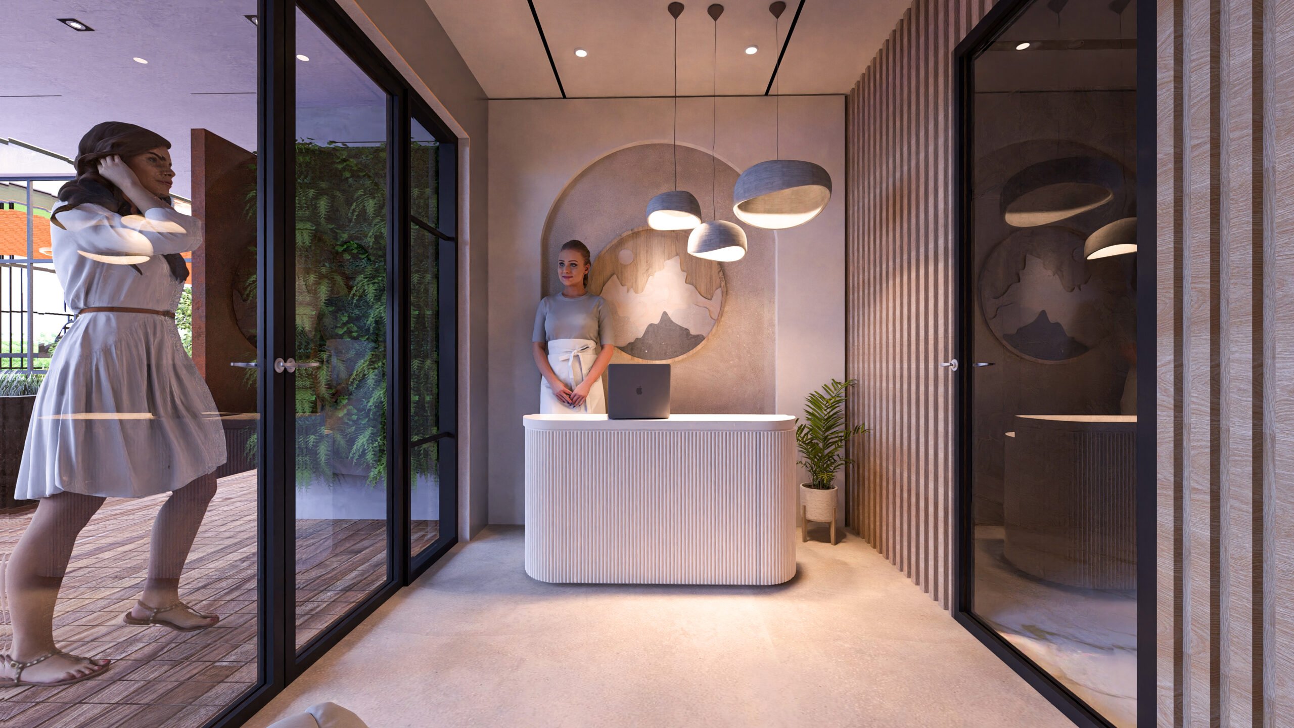 thoughtfully curated spaces. The reception area sets the tone of luxury with rich marble finishes,