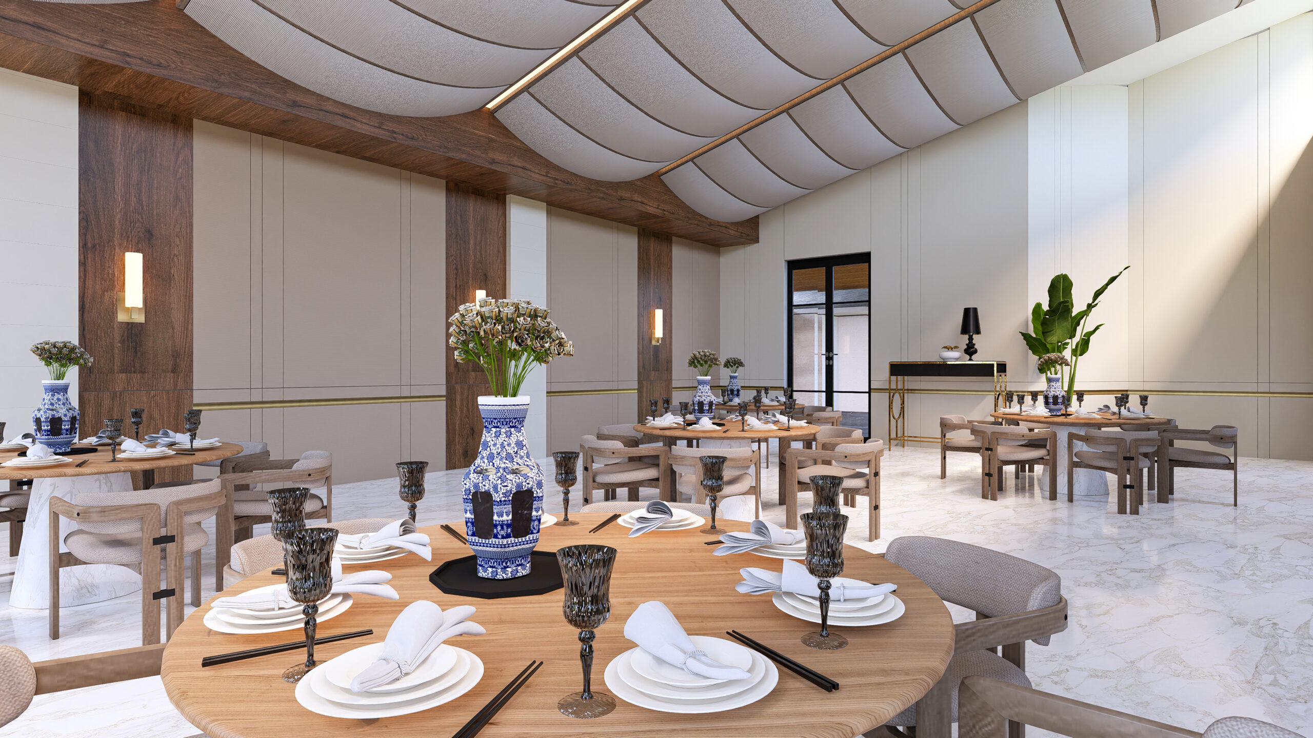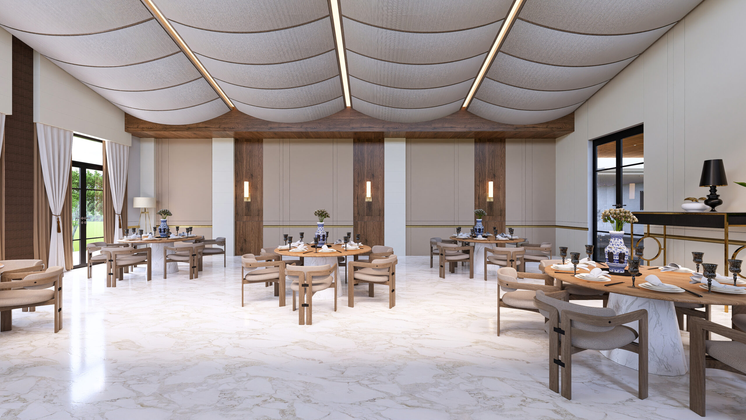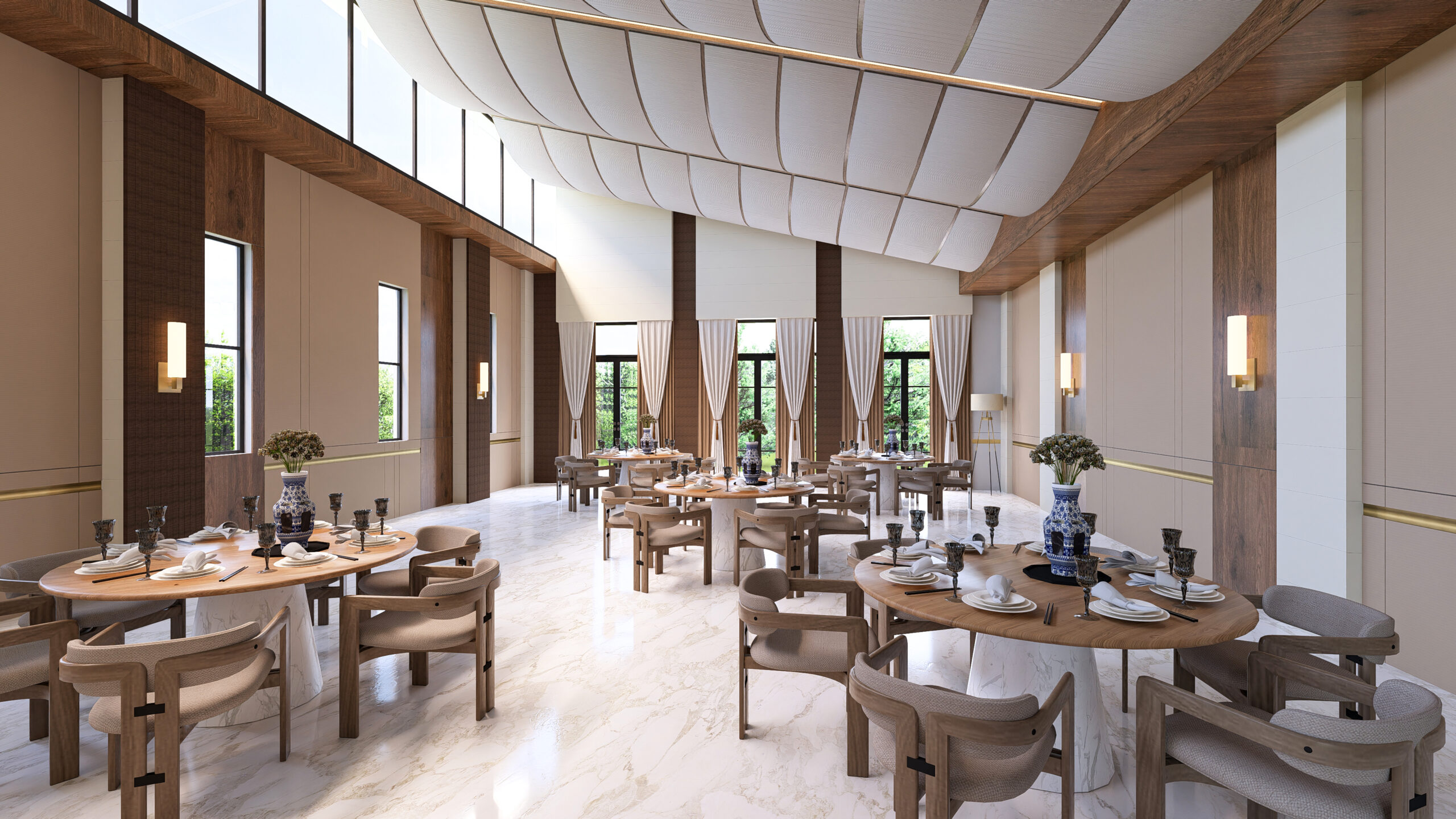 warm brass accents, and a reflective ceiling that enhances light and grandeur.