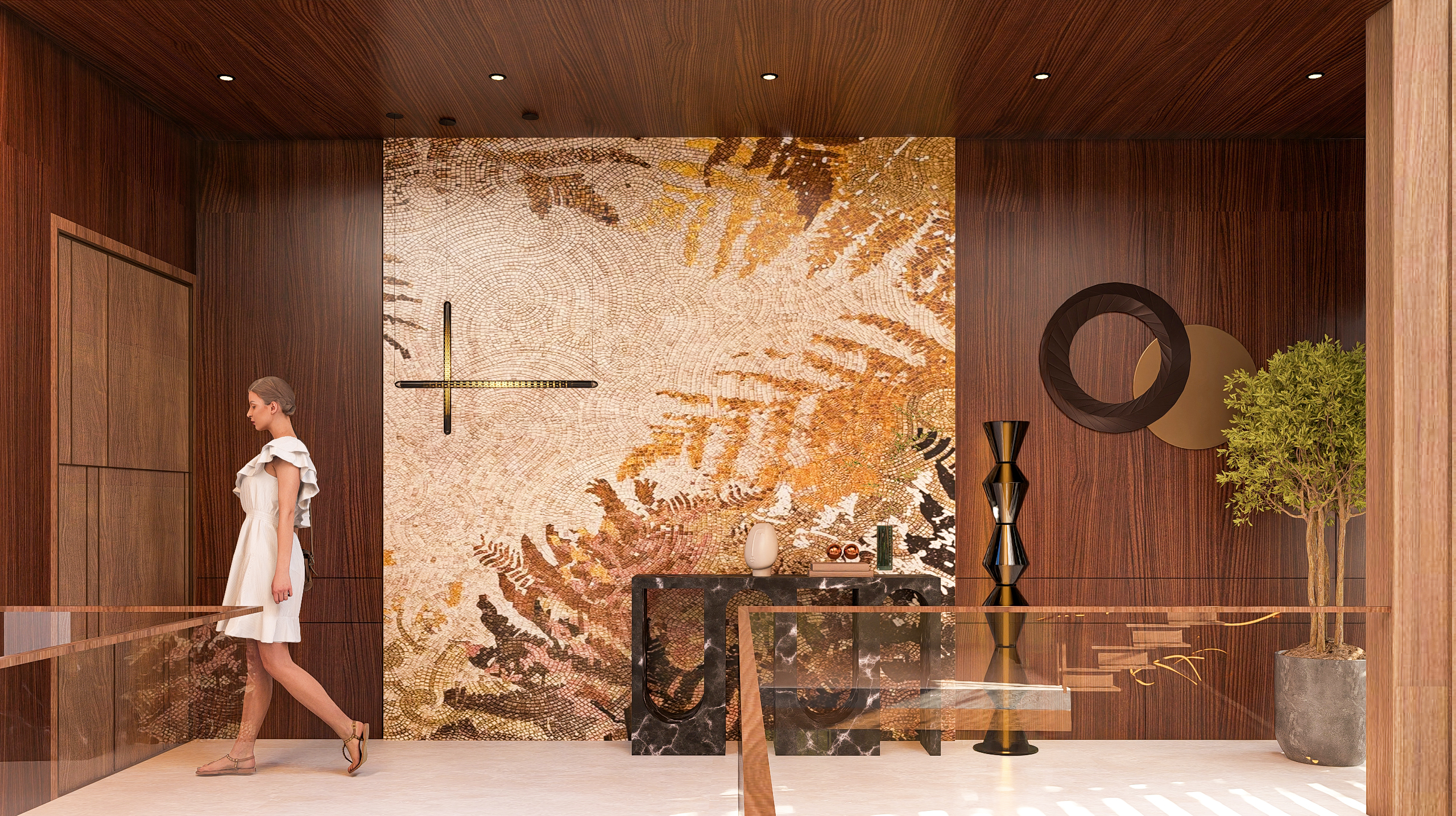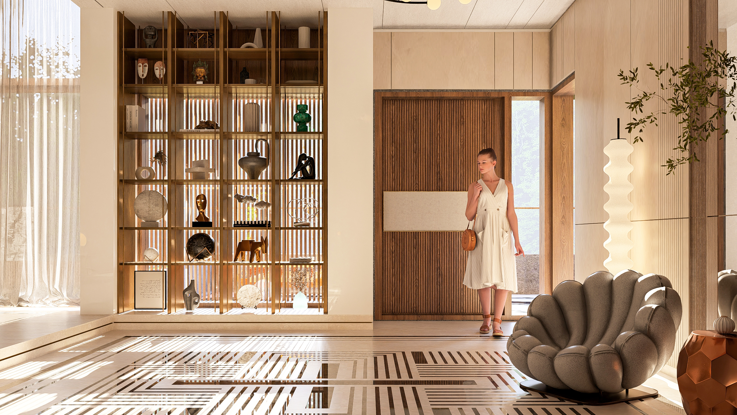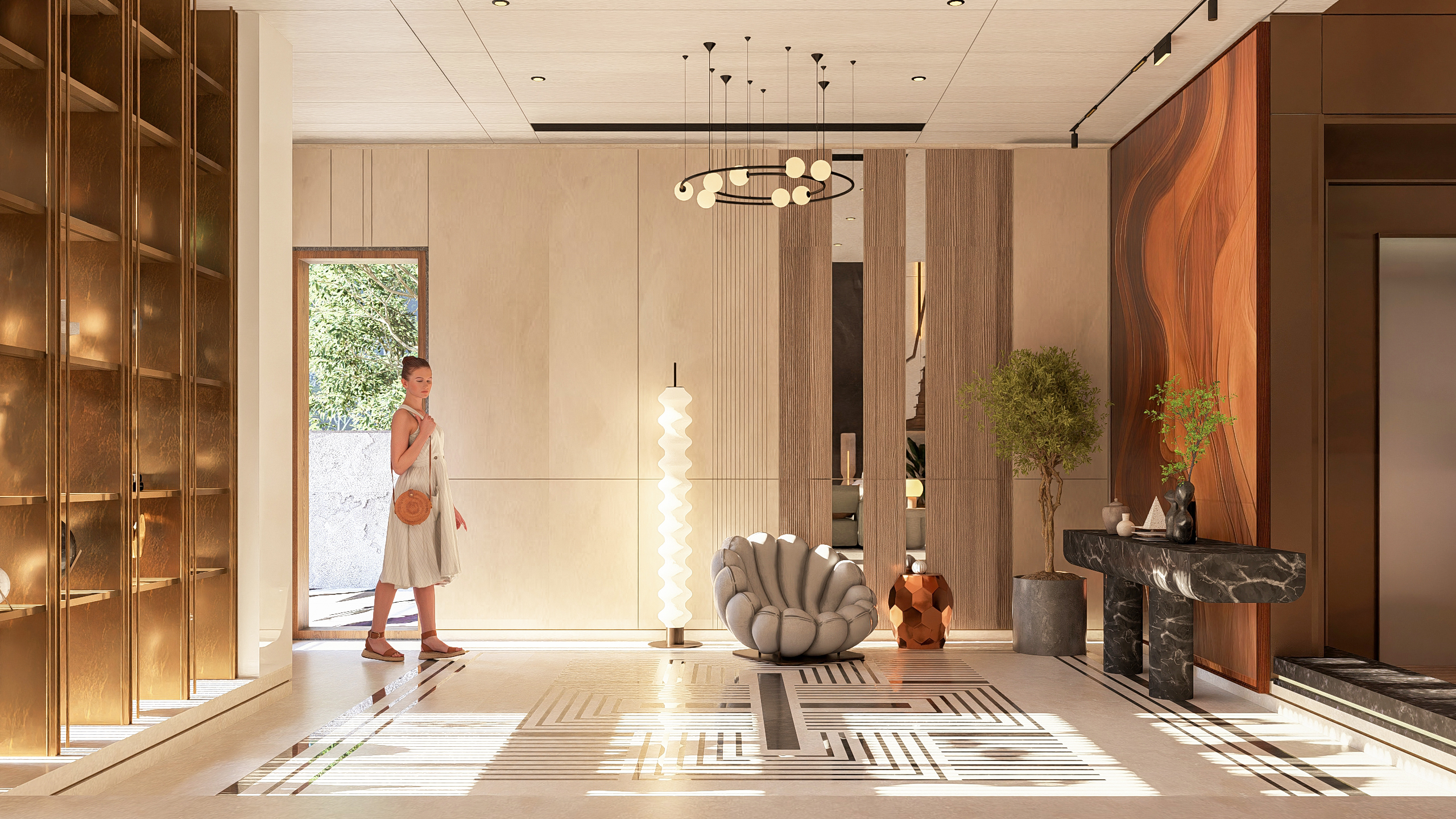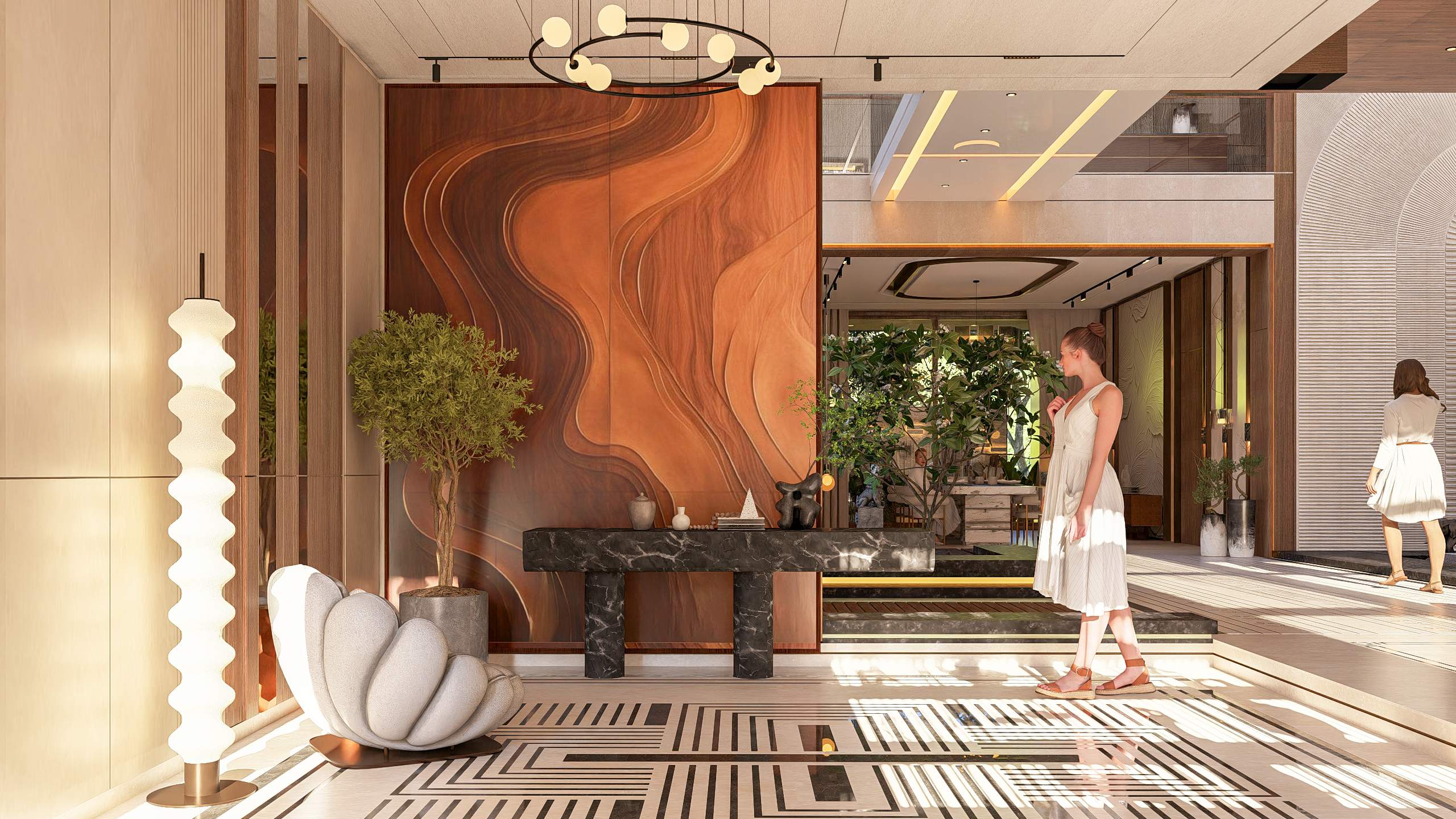 Entry foyer and living zones feature sculptural three-dimensional relief panels in pale stone, while darker marble varieties frame feature walls and structural columns. Warm timber accents in vertical slat screens and millwork provide textural contrast against the cool elegance of stone surfaces.