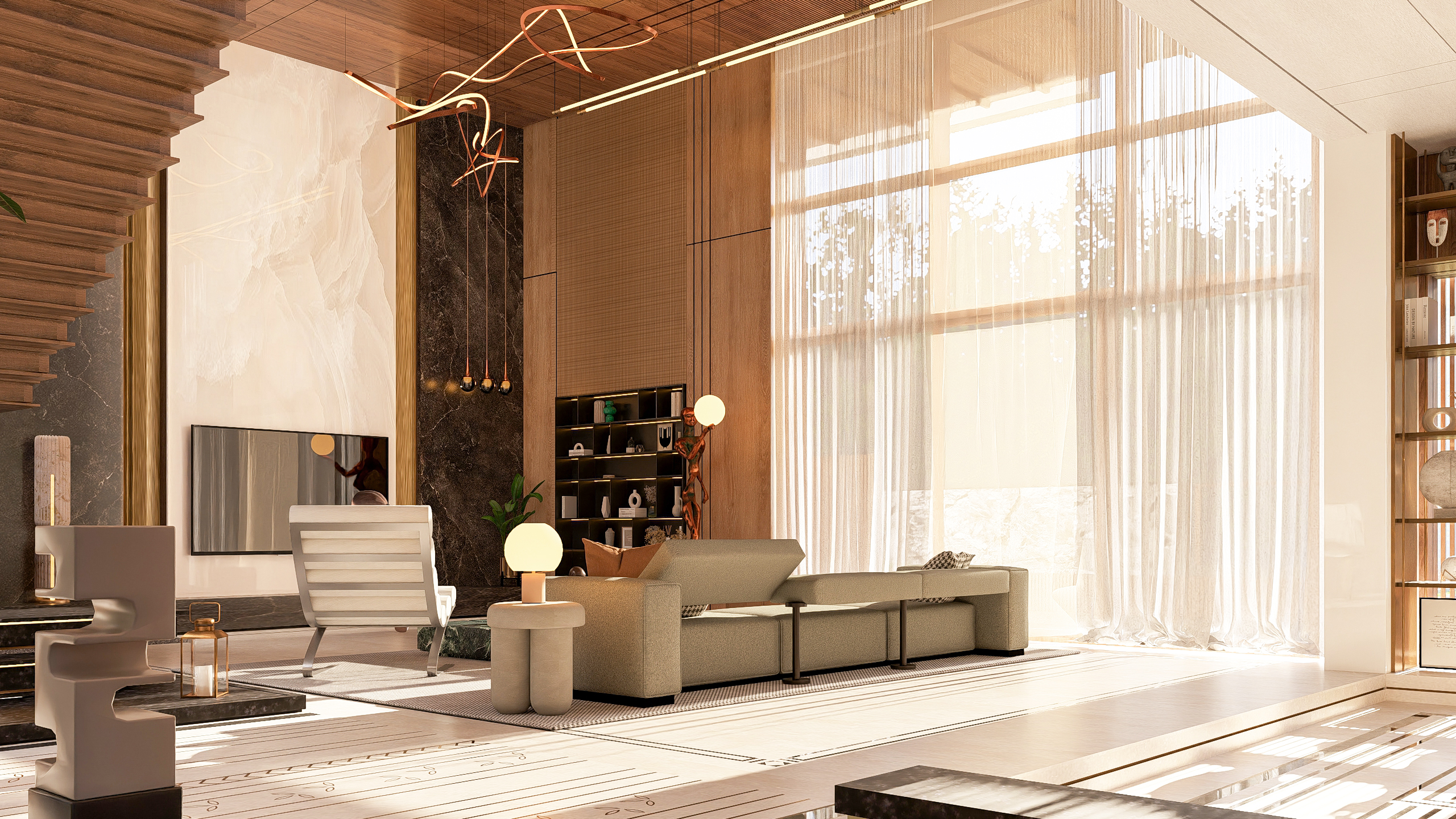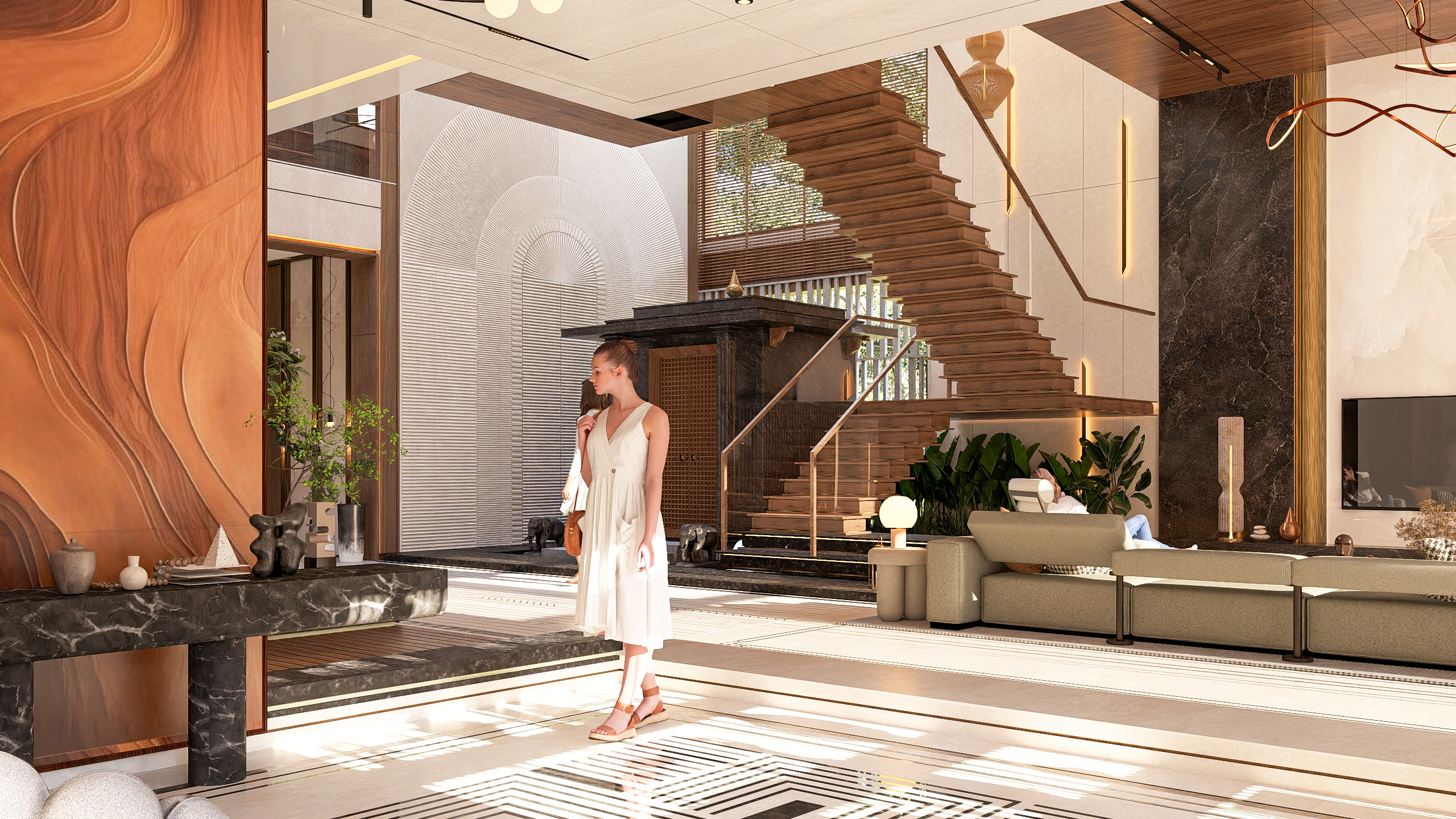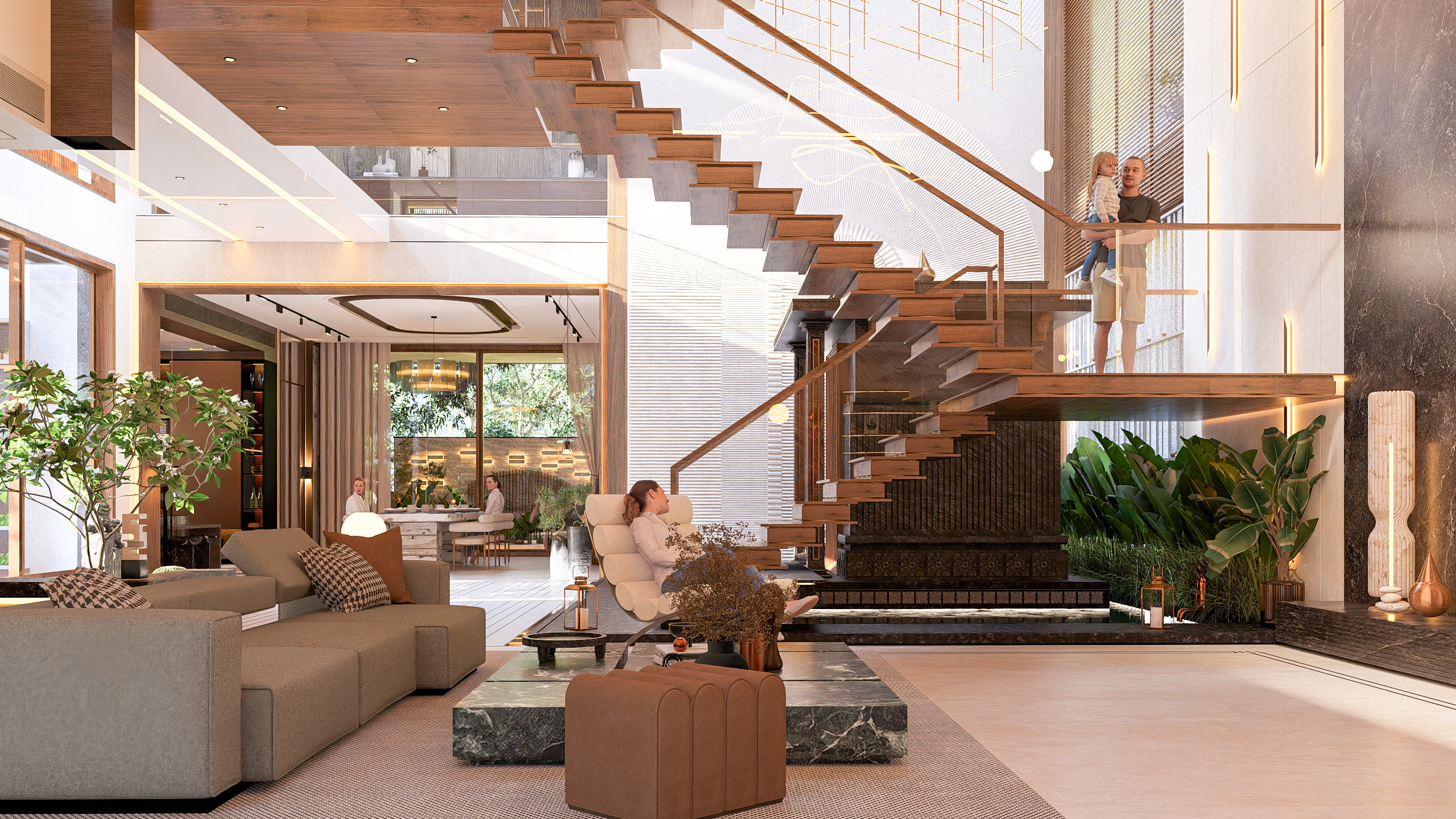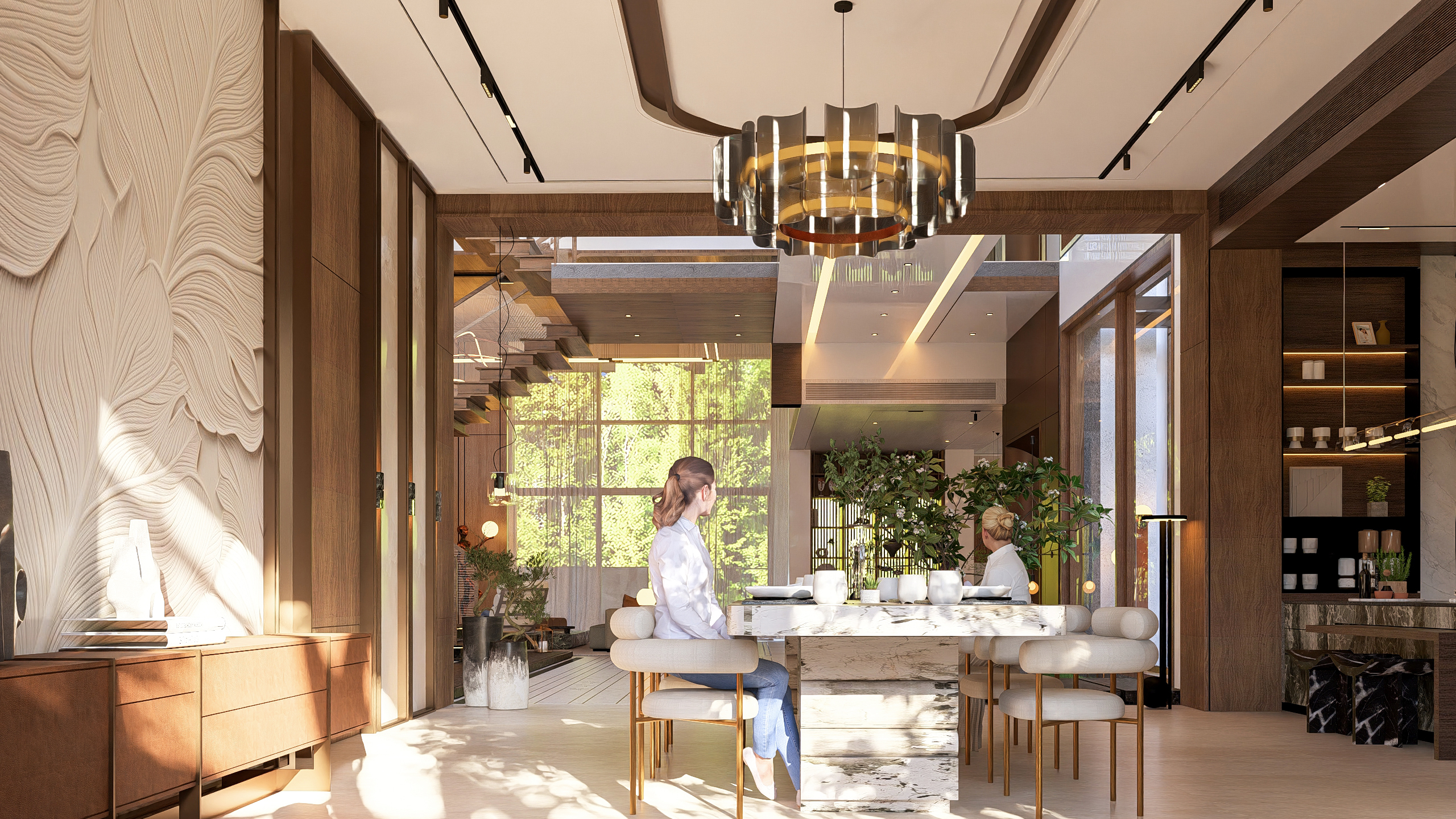 The double-height living space establishes volumetric drama, anchored by a cantilevered timber staircase that functions as sculptural centerpiece. Open-plan dining areas feature statement marble dining tables complemented by soft-form upholstered seating in neutral tones. Custom lighting, including circular metal chandeliers and pendant clusters, adds warmth and visual rhythm to high ceiling planes. Vertical timber screens define zones while maintaining visual connection between public spaces.