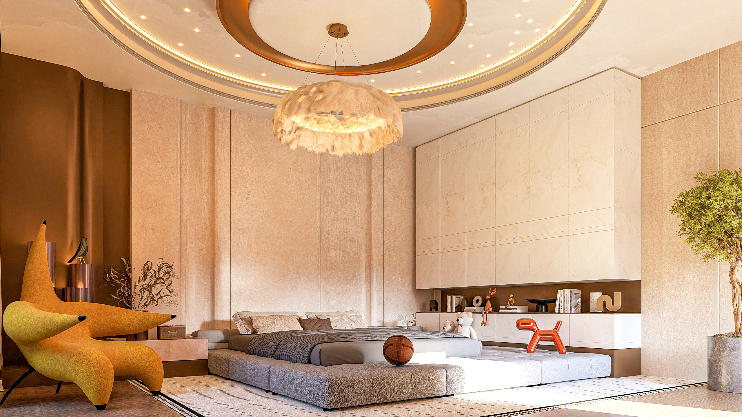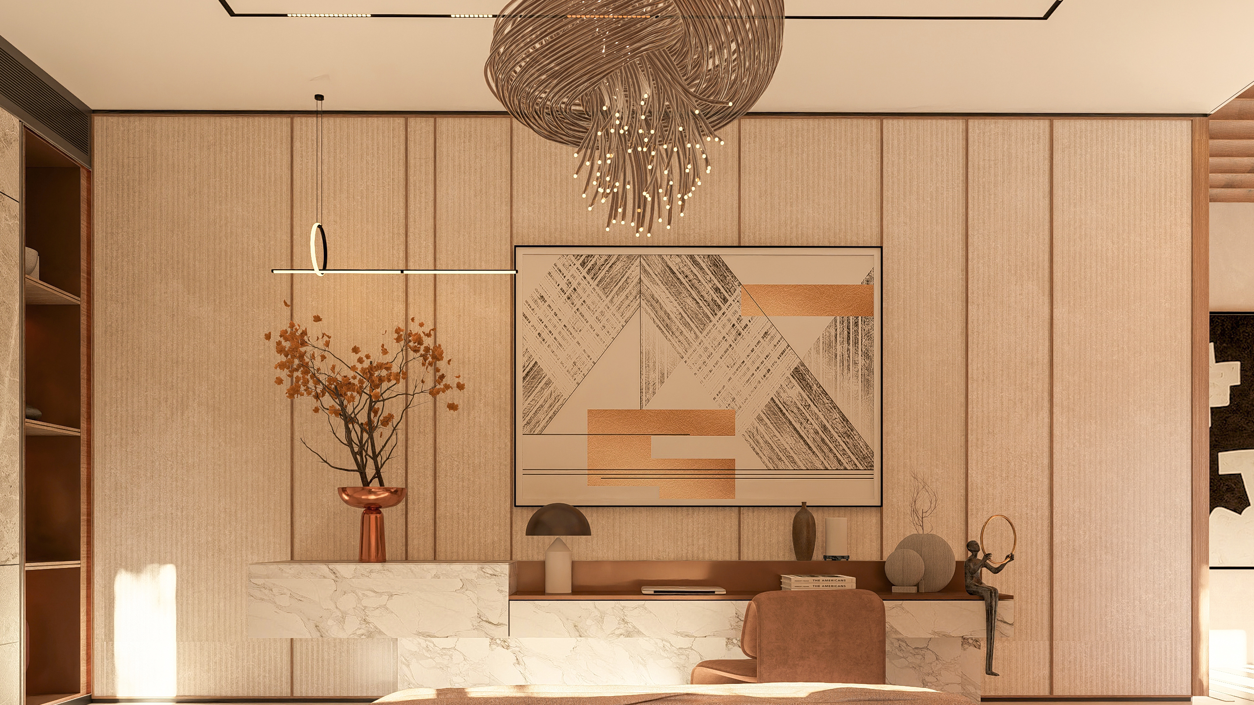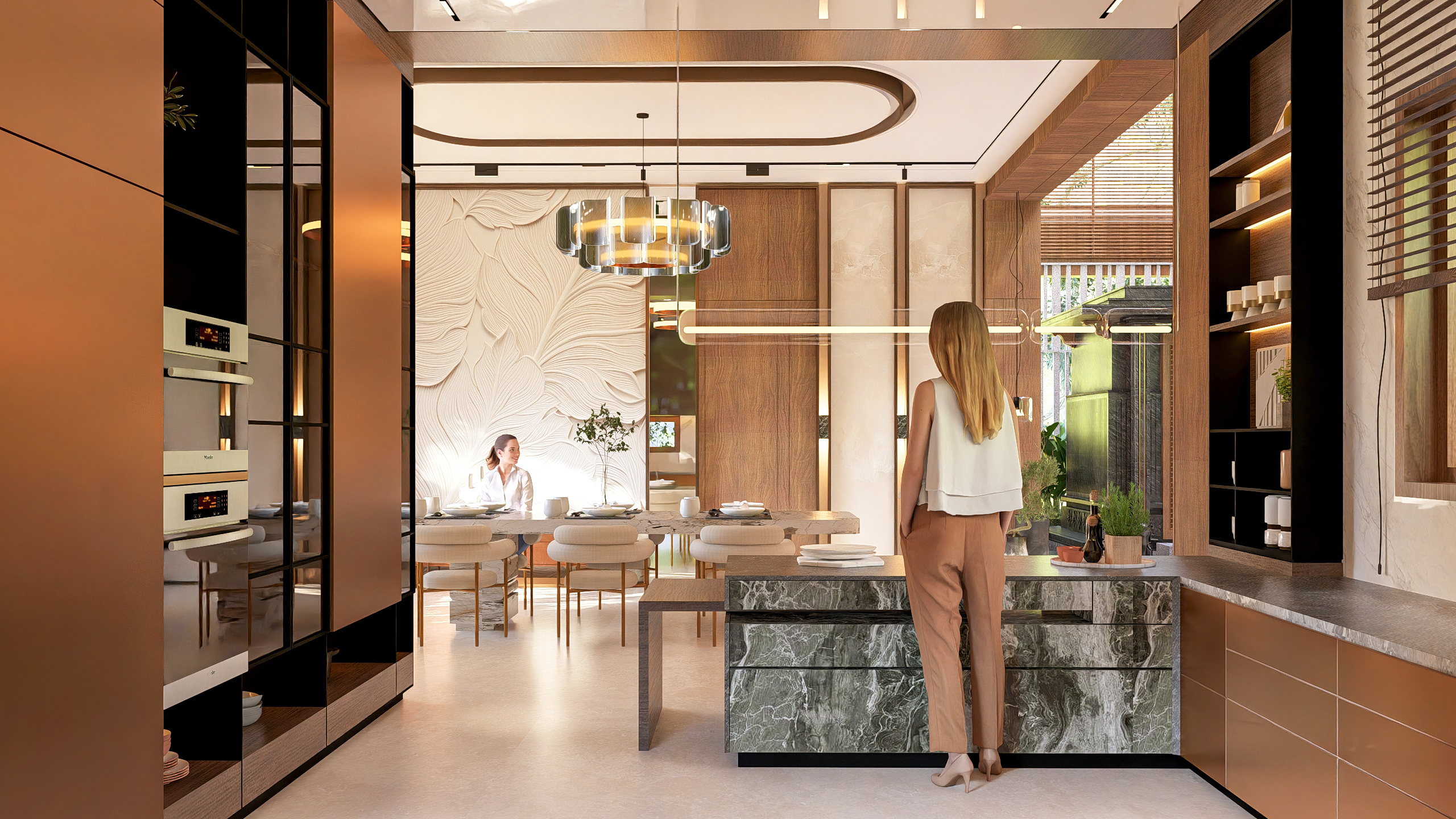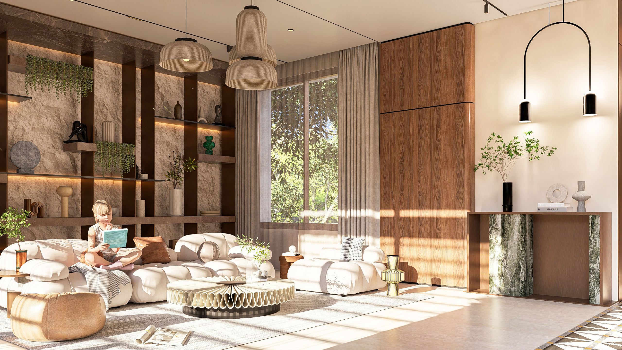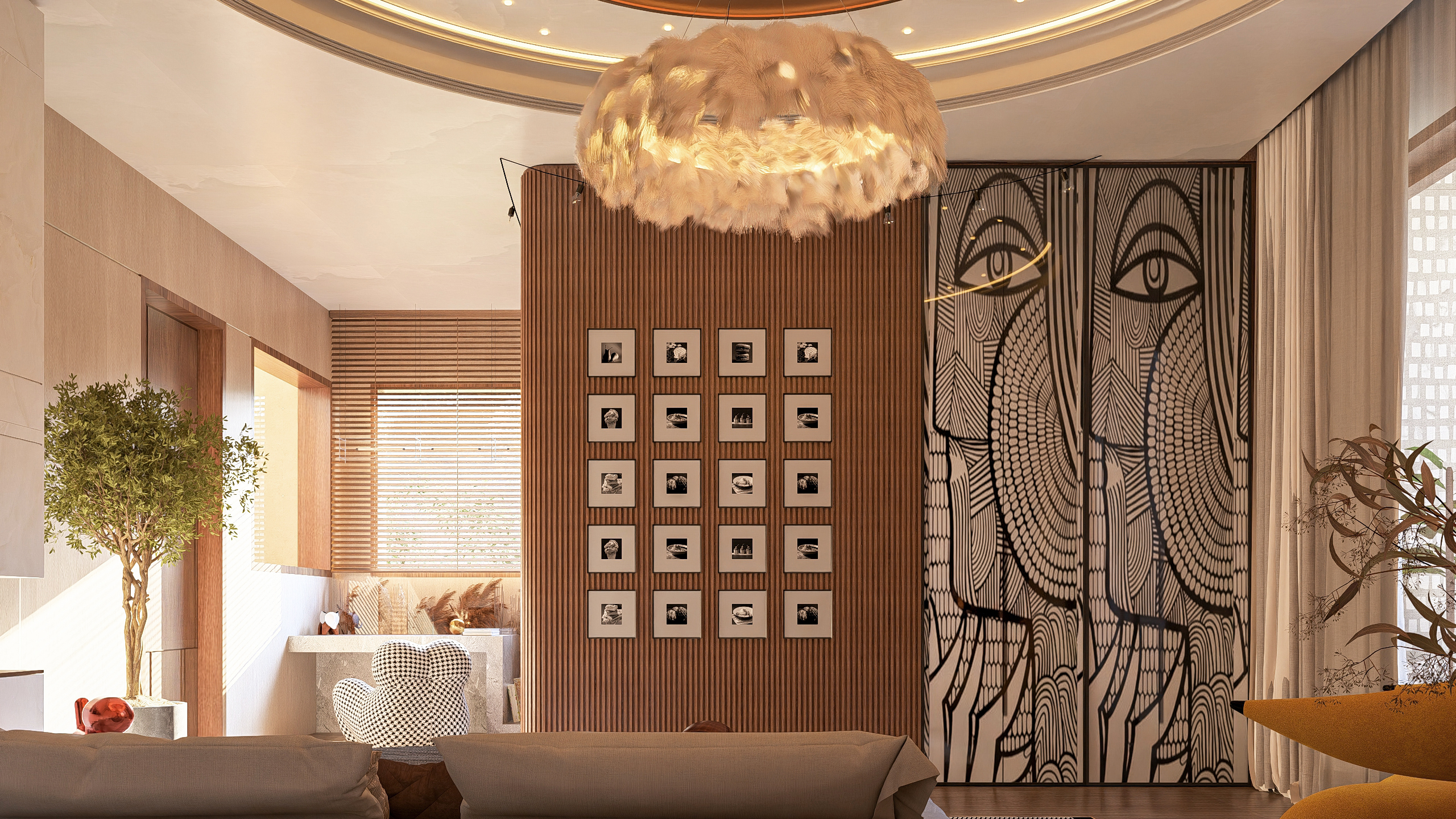 The double-height living space establishes volumetric drama, anchored by a cantilevered timber staircase that functions as sculptural centerpiece. Open-plan dining areas feature statement marble dining tables complemented by soft-form upholstered seating in neutral tones. Custom lighting, including circular metal chandeliers and pendant clusters, adds warmth and visual rhythm to high ceiling planes. Vertical timber screens define zones while maintaining visual connection between public spaces.