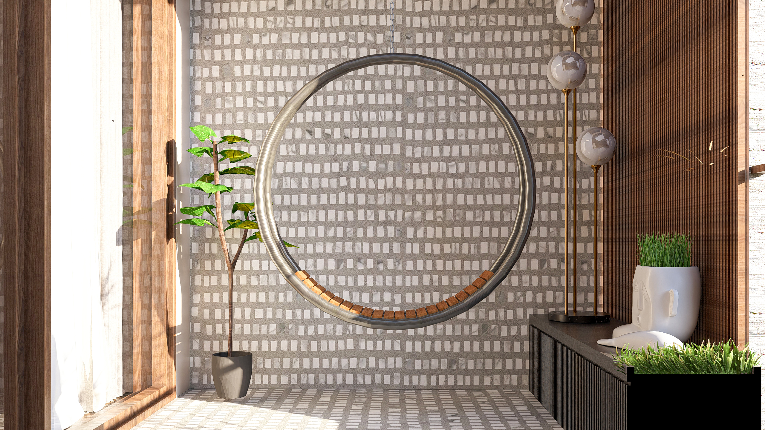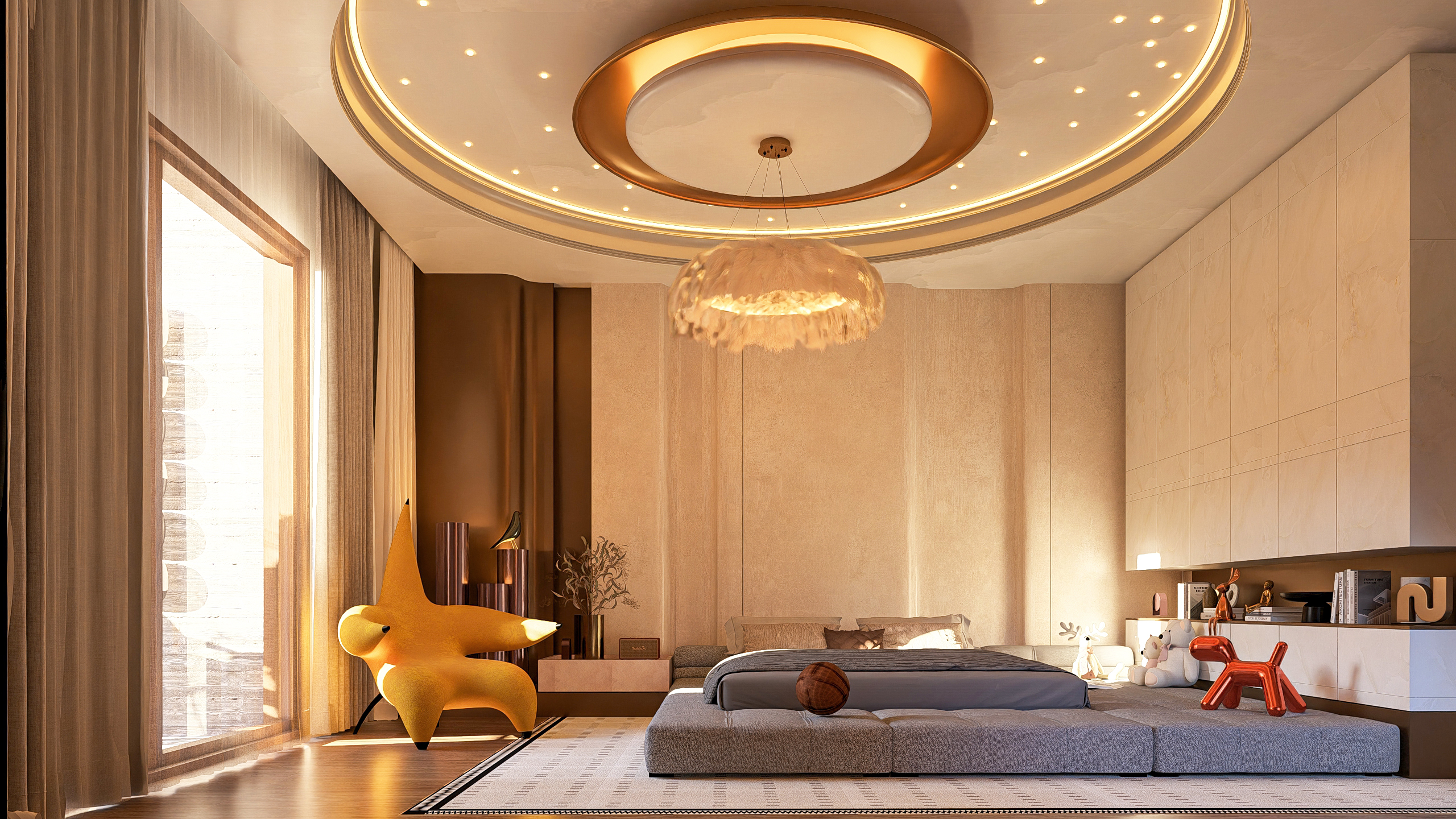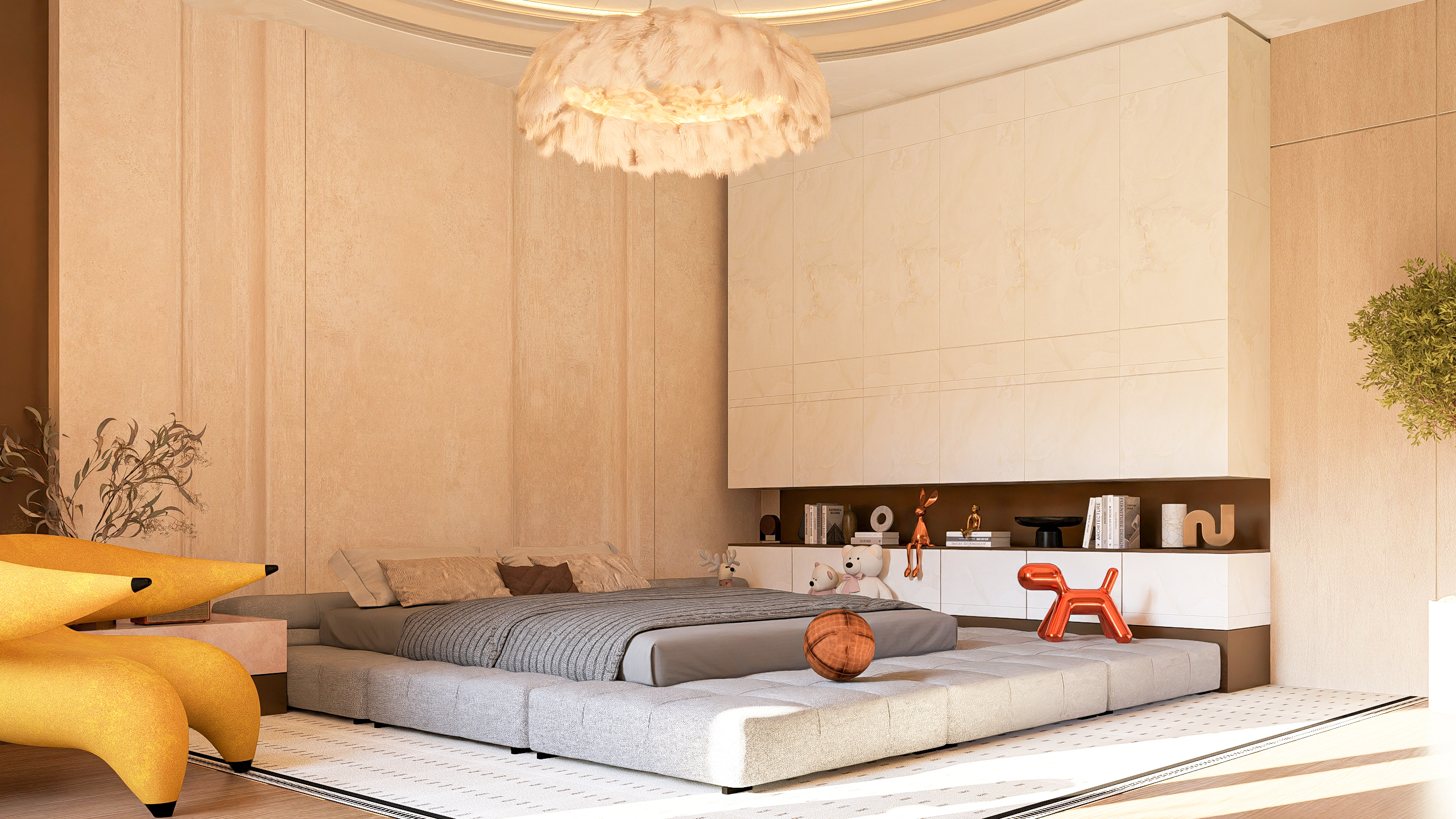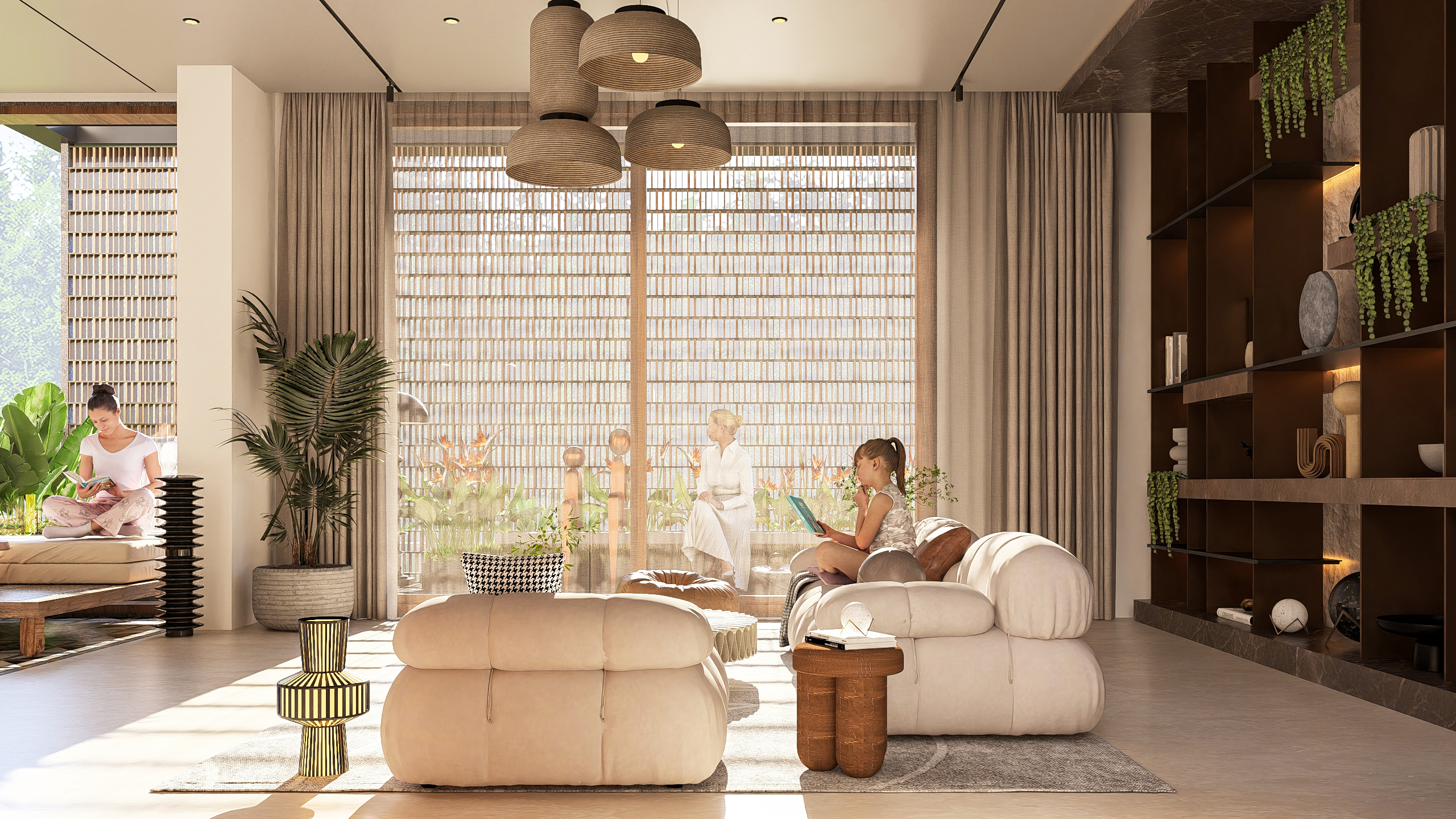 The double-height living space establishes volumetric drama, anchored by a cantilevered timber staircase that functions as sculptural centerpiece. Open-plan dining areas feature statement marble dining tables complemented by soft-form upholstered seating in neutral tones. Custom lighting, including circular metal chandeliers and pendant clusters, adds warmth and visual rhythm to high ceiling planes. Vertical timber screens define zones while maintaining visual connection between public spaces.
