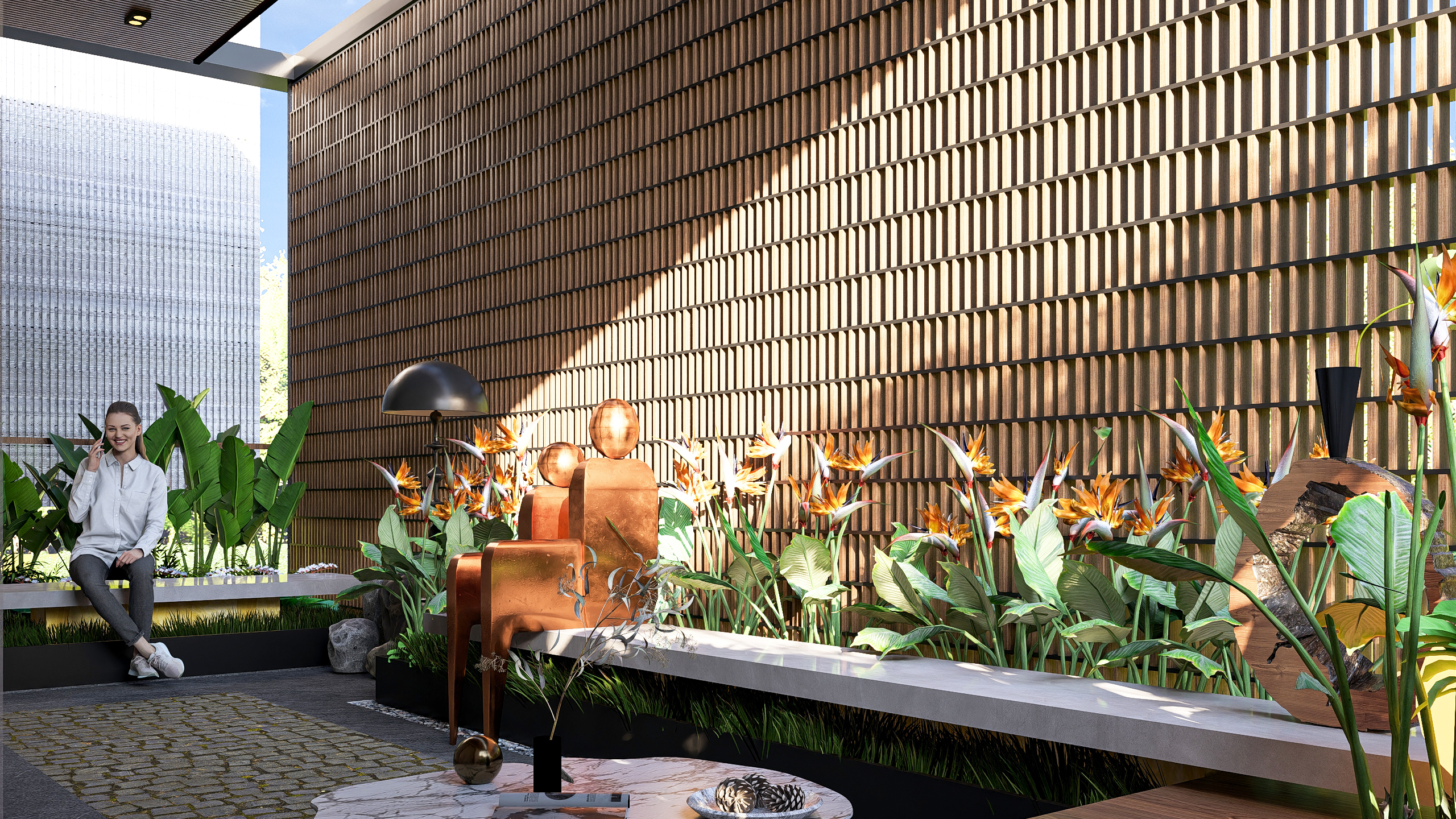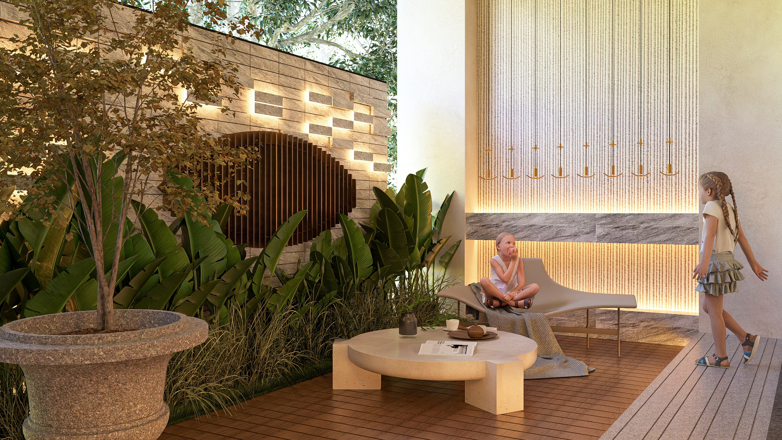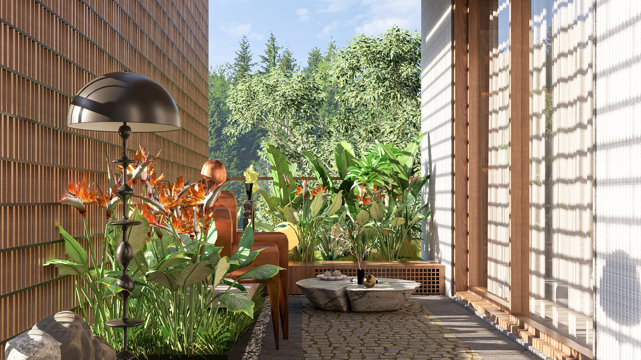 Strategic pocket balconies carved into the facade create intimate outdoor moments at multiple levels. These recessed spaces feature integrated planters with greenery that animates the facade, while providing residents private exterior zones for air and light without compromising interior climate control. The balconies establish layered depth and visual interest through alternating solid and void rhythms.