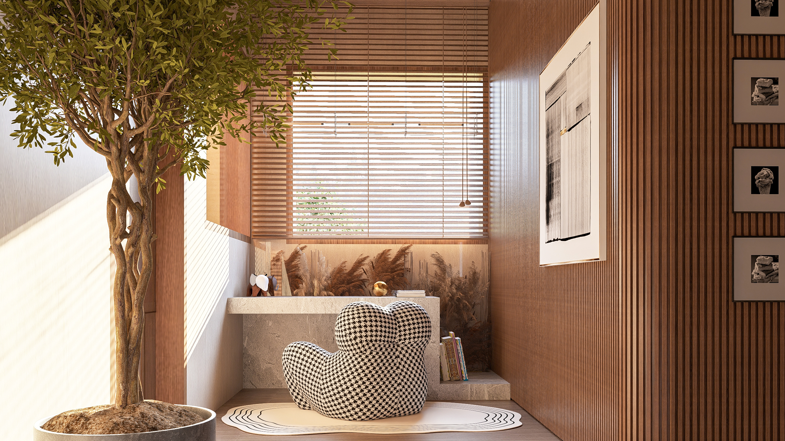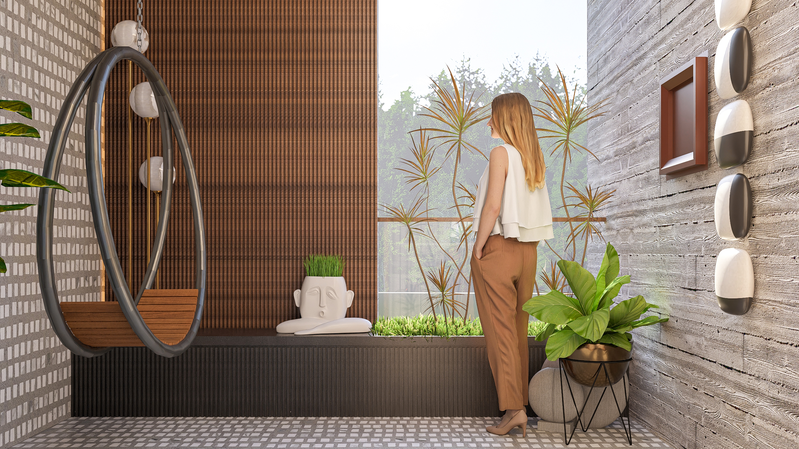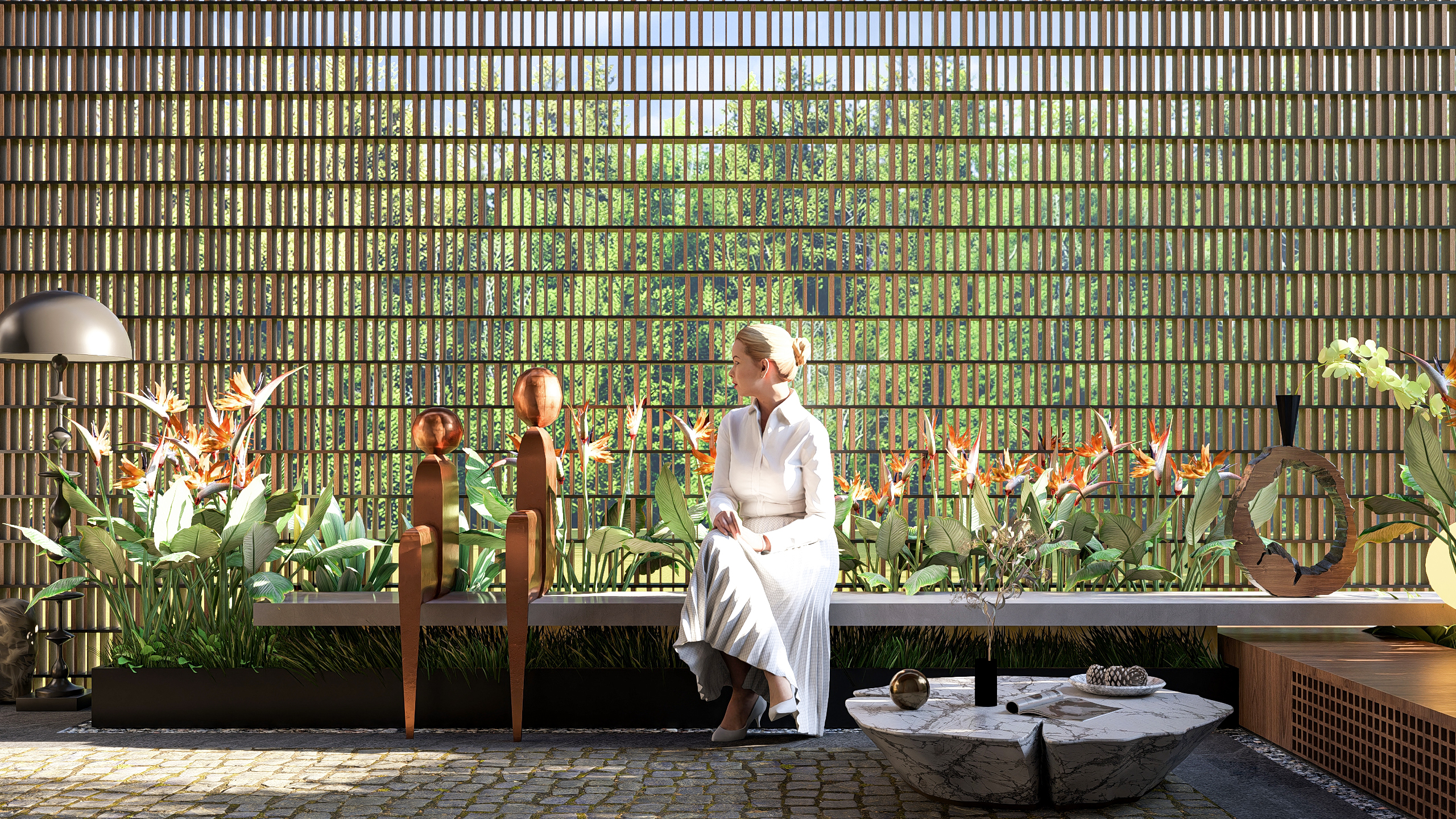 Strategic pocket balconies carved into the facade create intimate outdoor moments at multiple levels. These recessed spaces feature integrated planters with greenery that animates the facade, while providing residents private exterior zones for air and light without compromising interior climate control. The balconies establish layered depth and visual interest through alternating solid and void rhythms.