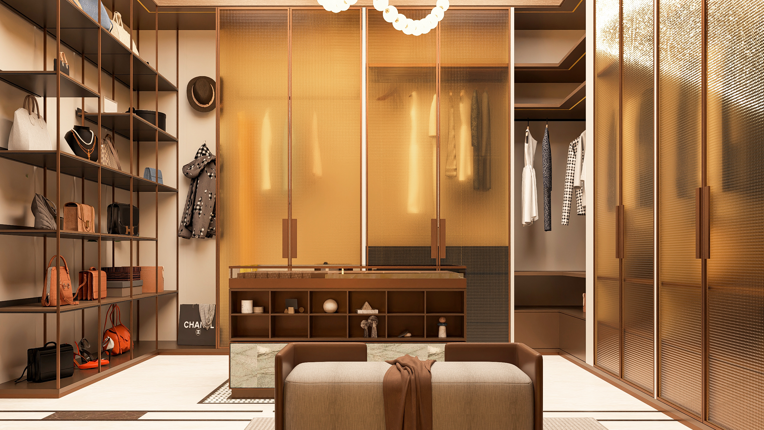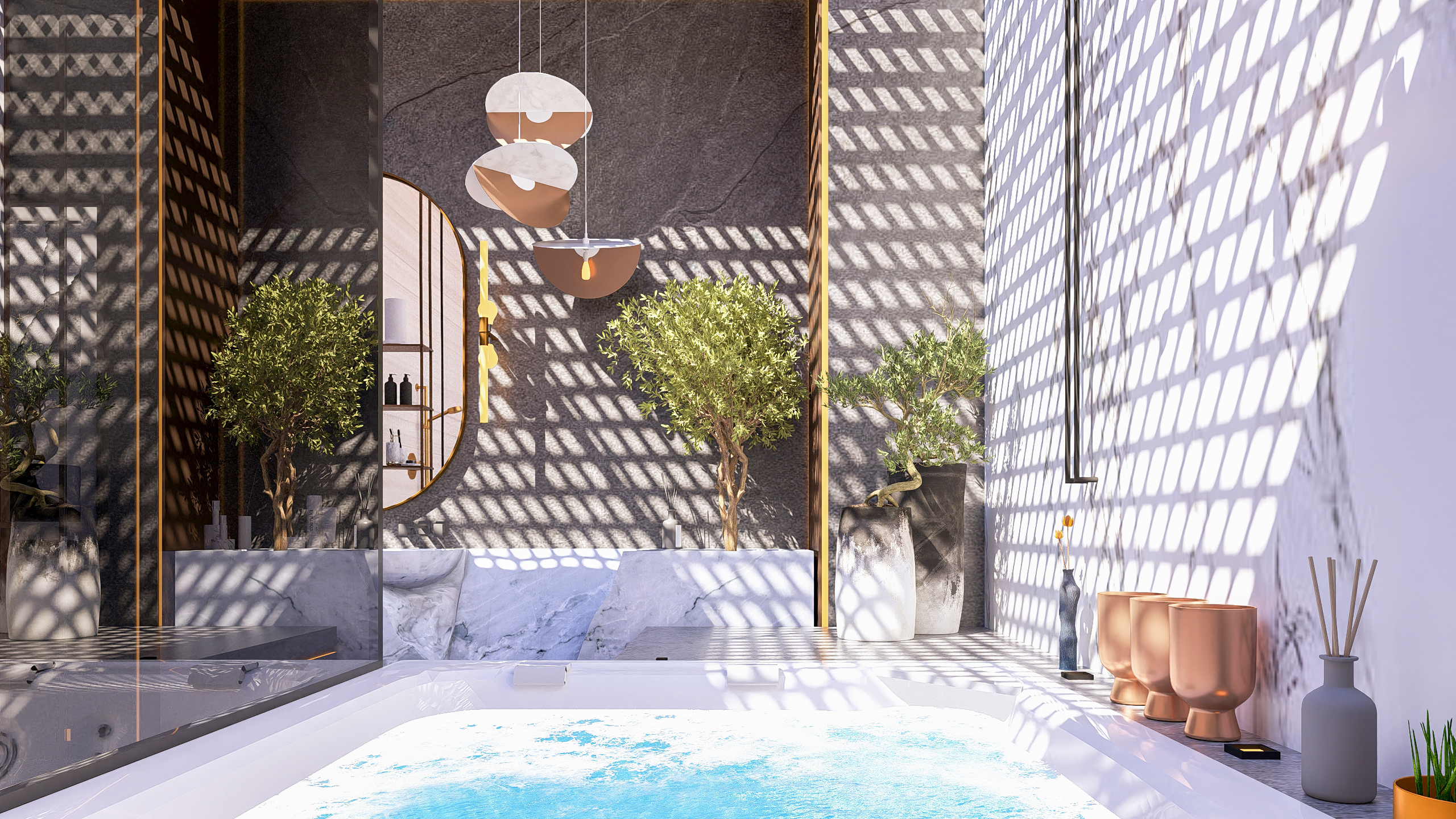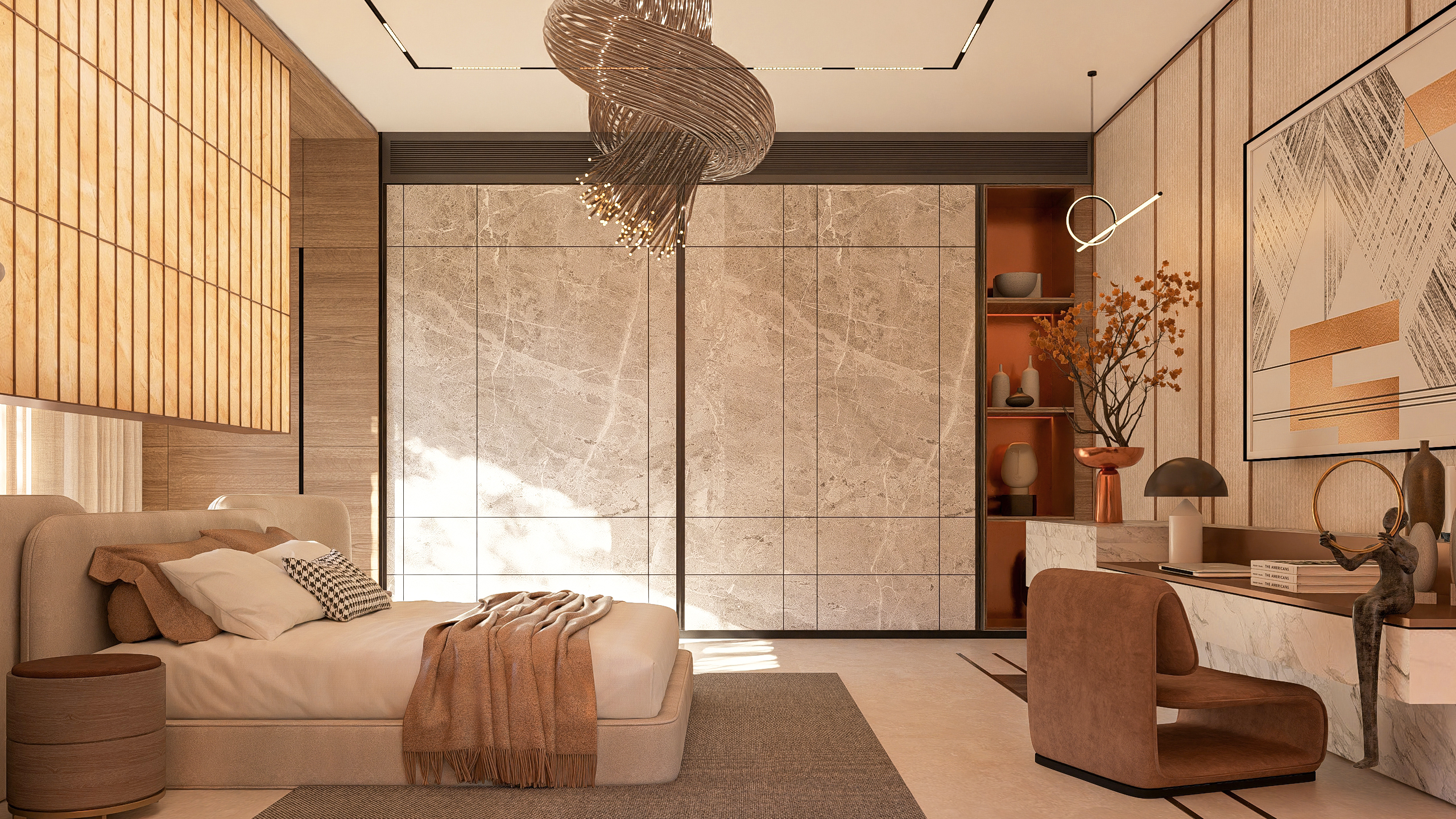 The design celebrates natural stone as the primary architectural vocabulary. Full-height marble wall panels, veined stone feature walls, and polished slab surfaces create dramatic visual impact throughout.
