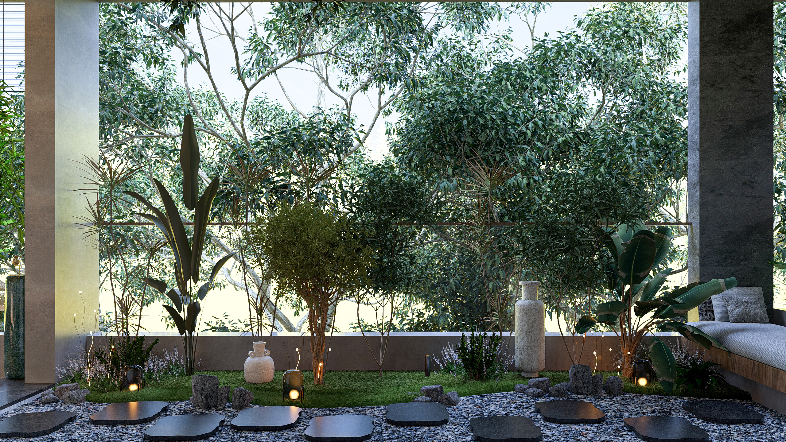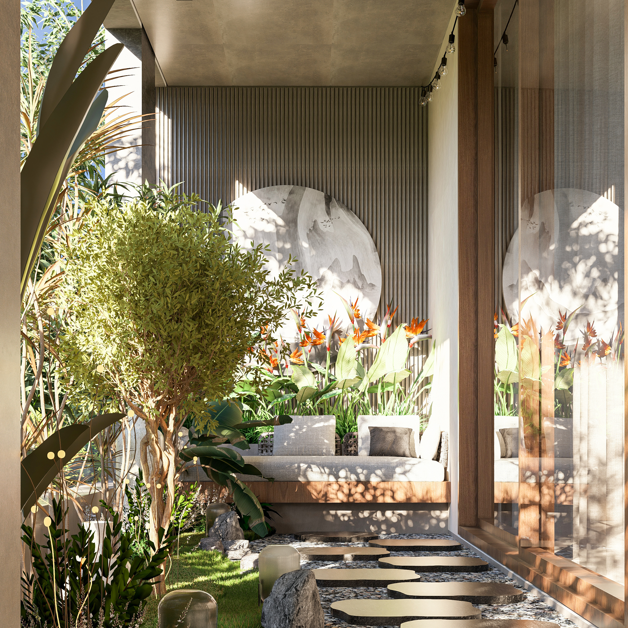 Ground-level private courtyard spaces connect indoor living with landscape through floor-to-ceiling glazing and horizontal planters. Stepped stone pavers navigate lawn areas, while concrete structural frames define edge boundaries and support upper-level balcony volumes.