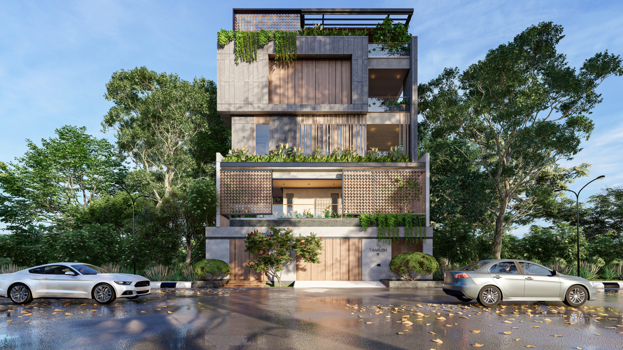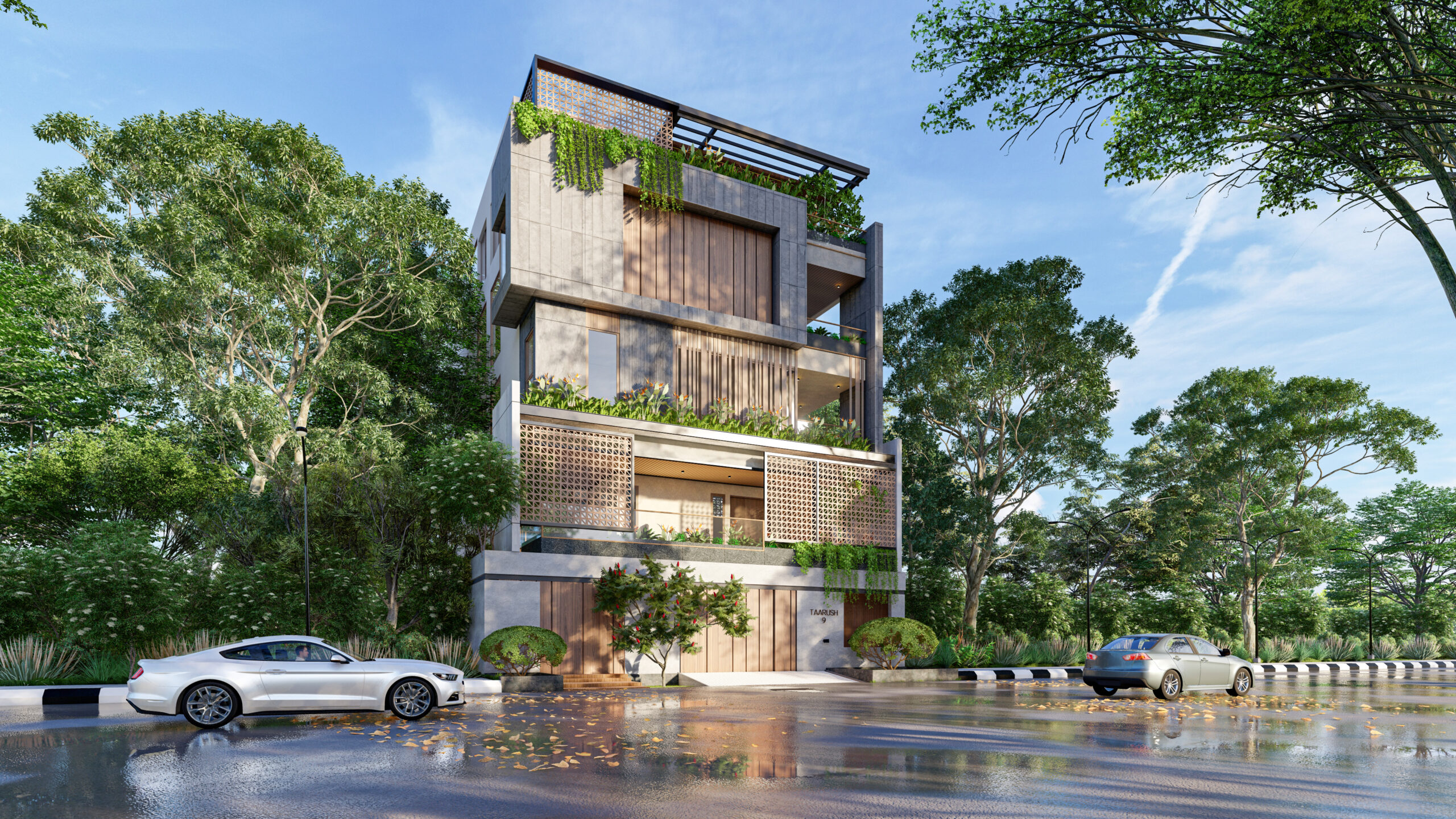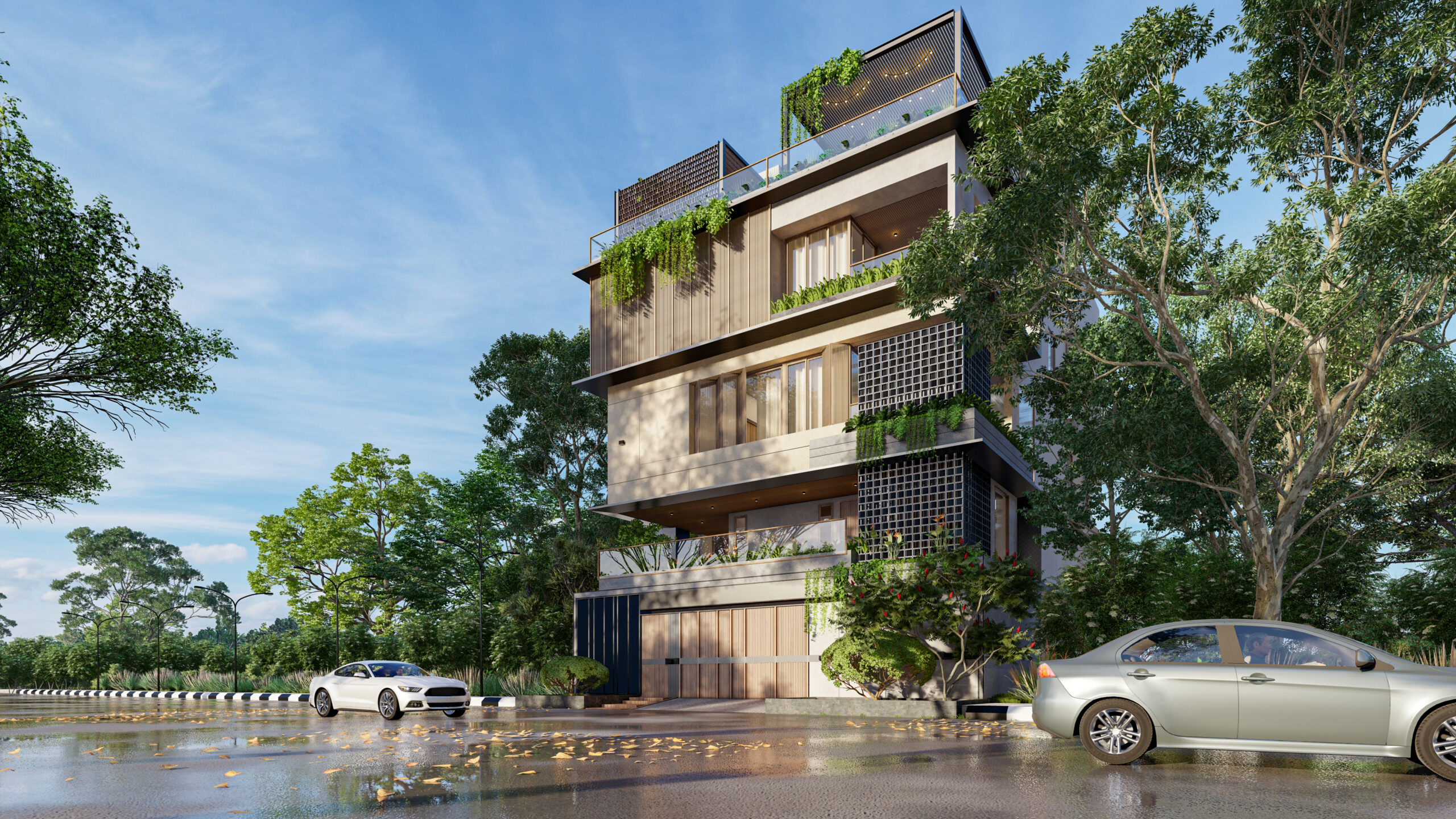 Generous integrated planter boxes at each level support cascading greenery that softens the architectural volumes. Ground-level landscape features mature ornamental trees, sculpted shrubs, and flowering plants that establish a verdant entry sequence.