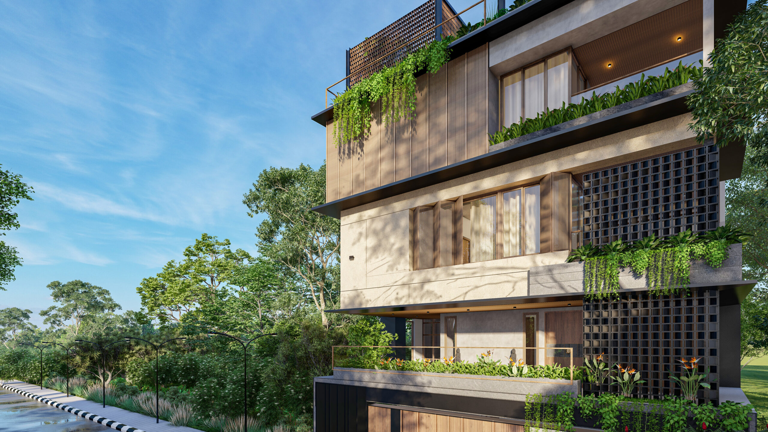 The facade employs a three-layer strategy, clear glazing for primary views and natural light, vertical timber louvers for modulated light control and visual screening, and perforated jaali screens for privacy, allowing selective transparency between interior domestic spaces and the street context. This graduated approach maintains visual interest from the public realm while protecting interior activities from external observation.